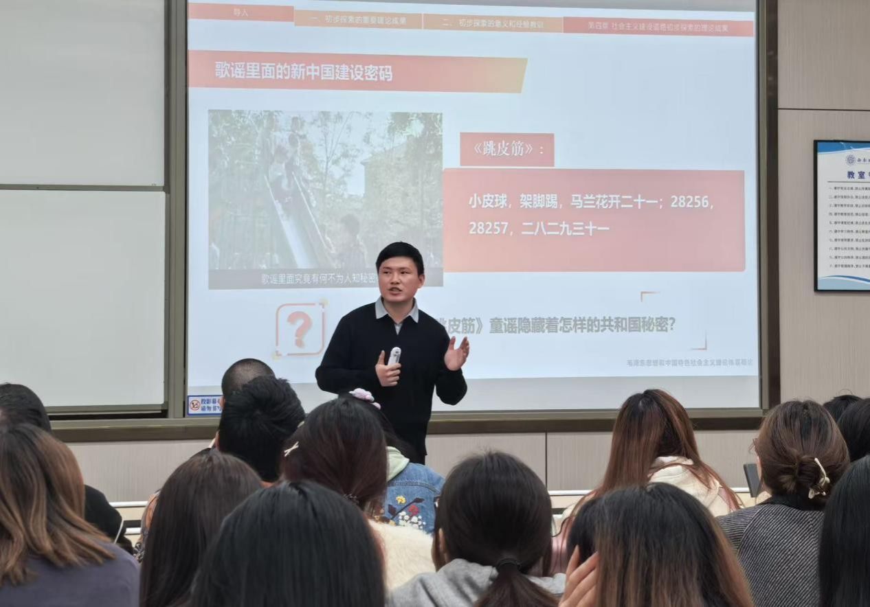 唐教成老师讲授的主题为“社会主义建设道路初步探索的理论成果”。在课堂上,他巧妙地以“跳皮筋”歌谣作为切入点,重点讲解了从“以苏为师”到“以苏为鉴”这一历史转变,并深入浅出地阐述了我国在社会主义建设道路初步探索中所取得的重要理论成果。他较好地解答了如何立足中国国情,构建符合中国具体实际的社会主义建设道路的问题。课堂上,唐老师运用了案例教学、视频教学、师生互动等多种教学手段,有效激发了同学们的学习兴趣和深入思考。