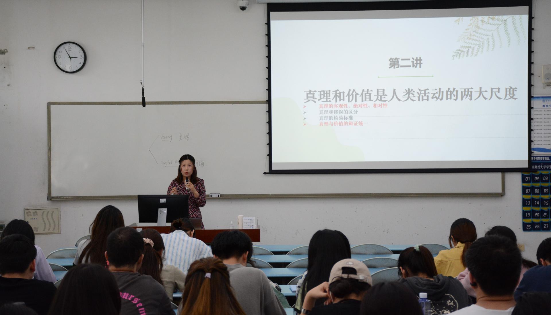 此次教学观摩课由倪晶晶老师主讲,讲授主题是“真理和价值是人类活动的两大尺度”。课堂上,倪晶晶老师先让学生预习5分钟的教材知识,然后通过认识维度中的“本来是什么”(being)与“我认为应该是什么”(ought to be)的问题,引出“真理与价值”话题;接着,通过讲解柏拉图在《理想国》第七卷中著名的“洞穴寓言”,激发学生对古希腊时期有关理性、真理、价值等问题的思考;再者,通过提问“世界上有永恒不变的绝对真理吗?”的问题,导出马克思的真理观之于符合论真理观、实在论真理观、融贯论真理观的科学所在。最后,通过对马克思的科学真理观的细致讲解,分析科学真理观的客观性、绝对性与相对性,回应“世界上有永恒不变的绝对真理吗?”的问题。