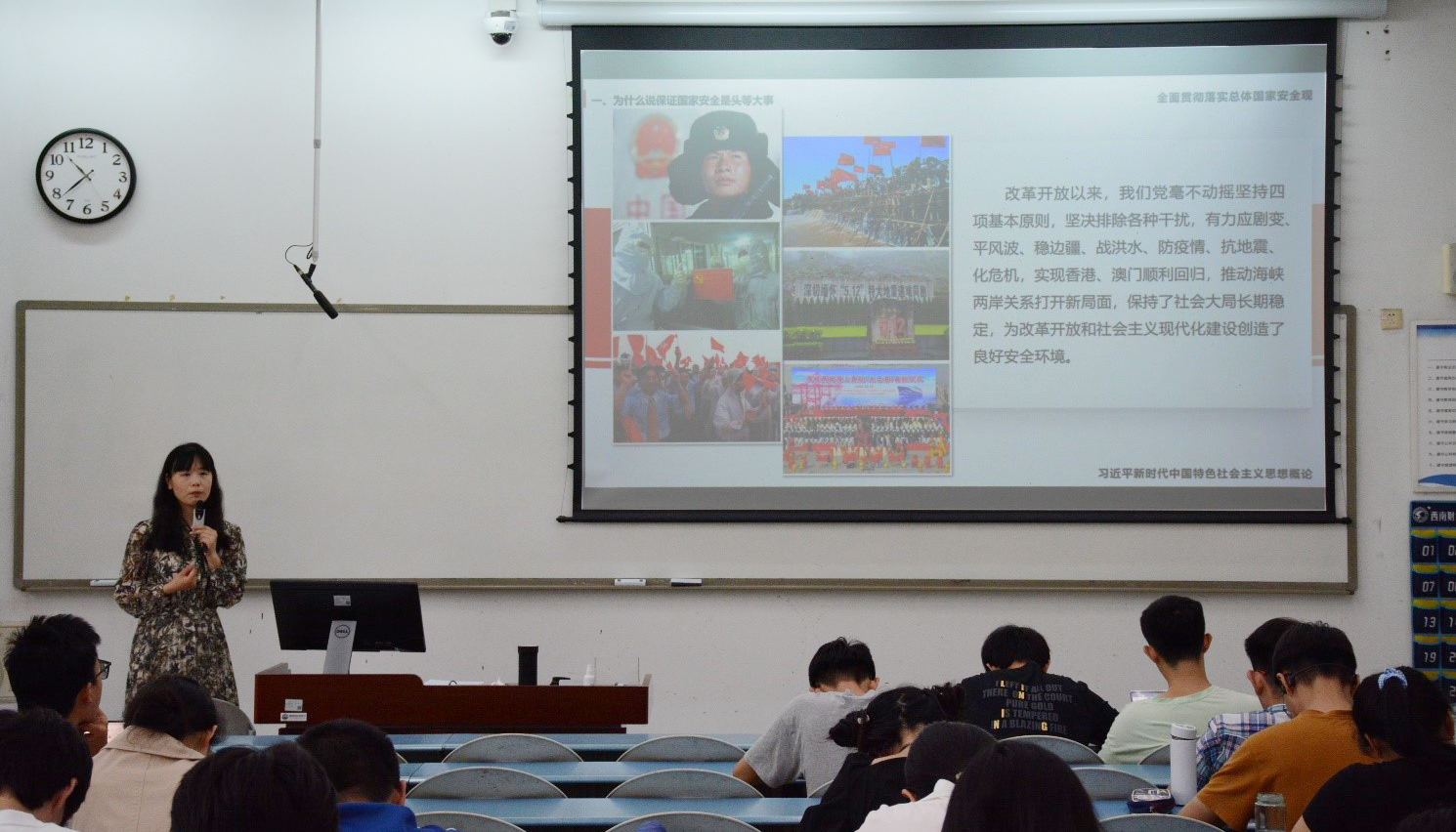 此次观摩课由何明洁老师主讲,讲授主题是“全面贯彻落实总体国家安全观”。何明洁老师首先利用混合式教学手段进行预习讨论和课程导入,通过梳理总结讨论发言,提出国家安全的基本概念。然后从“两个结合”、历史根源、发展需要、人民立场、风险挑战五个角度,结合党的二十大报告中对国家安全进行的专章论述阐明了国家安全的重要性:国家安全是民族复兴的根基,社会稳定是国家强盛的前提。授课中,何明洁老师还通过播放全民国家安全教育典型案例视频,展现我国当前所面临的复杂多变的安全和发展环境,普及全民国家安全教育相关知识,进一步提升大学生对国家安全重要性的认识,进一步树立“国家安全,人人有责”的主人翁意识。