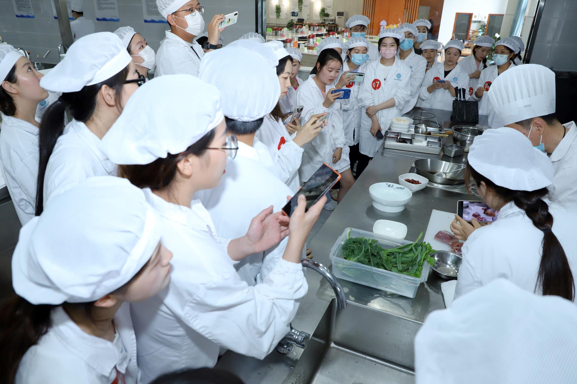 比赛分为三个环节。首先由后勤专业老师进行现场教学,参赛选手认真观摩学习。随后进行实际操作,各组选手在1个小时之内完成规定菜品——水煮肉片。选手们做好准备,手起刀落,在热烈的翻炒中,煸出生活的浓香,随即起锅,每一步都是对生活热爱的升温。最后评委老师现场品尝,从味感、质感、观感等方面进行综合评价。经过紧张激烈的角逐,最后评选出一等奖3组,二等奖6组,三等奖7组,优秀奖8组。