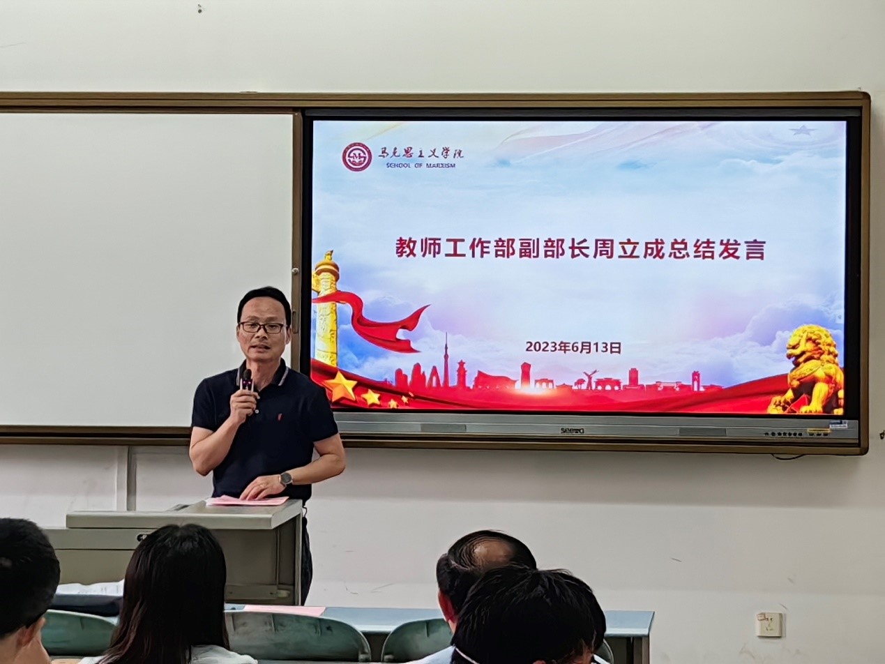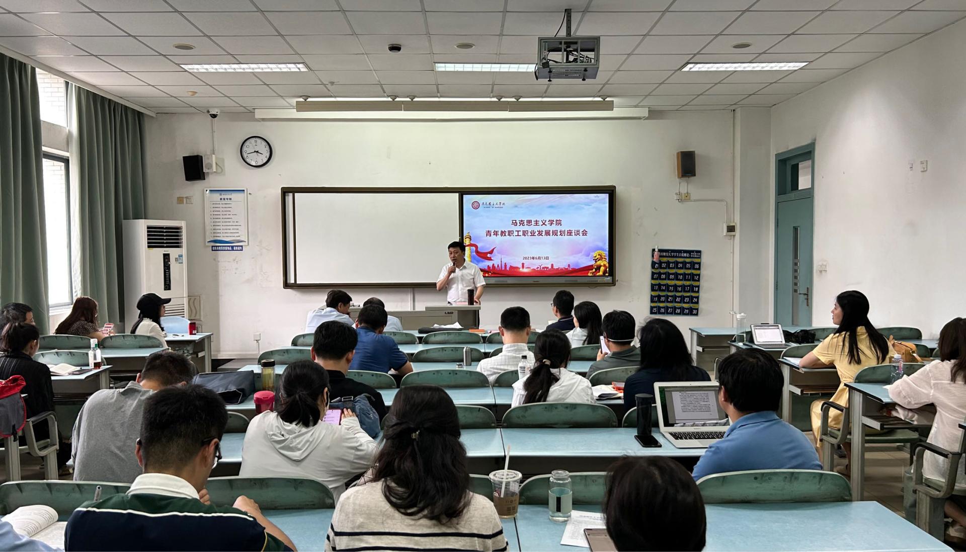2023年6月13日下午,马克思主义学院在经世楼B404举行青年教职工职业发展规划座谈会。会议由院长唐晓勇主持,学校党委教师工作部副部长周立成莅临指导座谈会,学院领导班子、教授委员会、规划辅导人以及全体青年教职工参加会议。