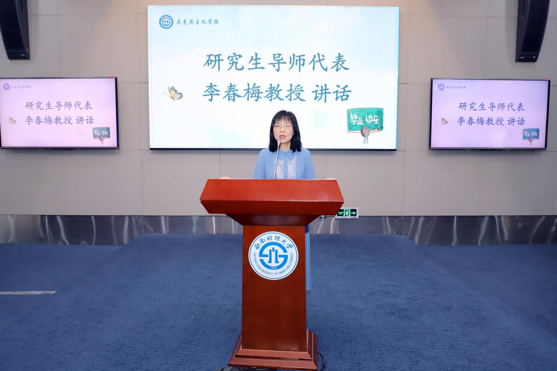 研究生导师代表李春梅教授嘱托大家要给自己直面内心需要的机会,在生活和工作中牢记“责任”与“选择”这两个人生关键词,做到对自己负责、对生活负责,希望大家有更多的勇气迎接生活的挑战,遵从内心做选择、坚定不移向前行。