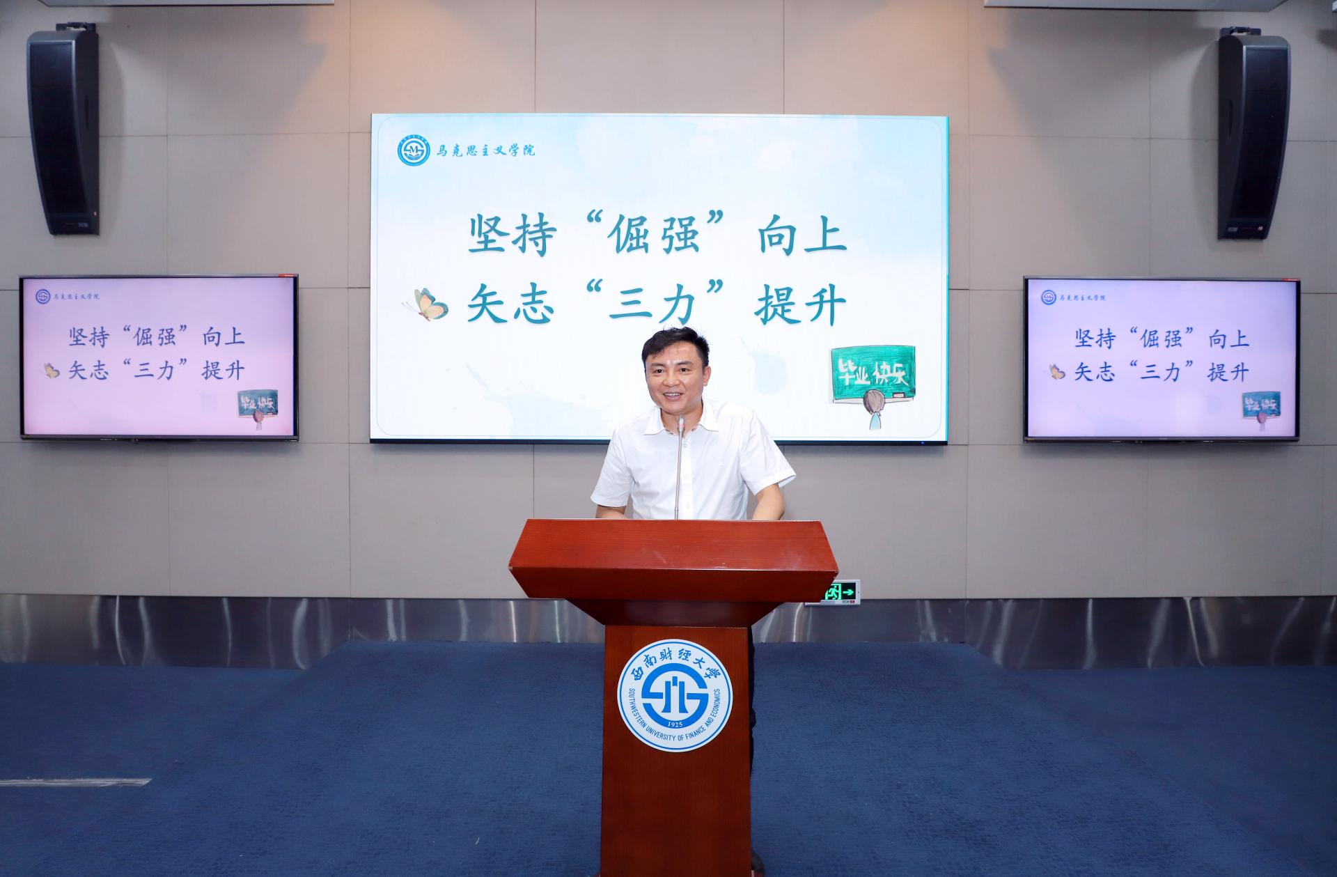 唐晓勇院长以“沸腾汇聚奔涌好时代,不负韶华创造新可能”为题向毕业生送上临别致辞,带领大家回顾了学院师生奋斗的成就和激昂的青春,嘱托大家“时代奔涌,青春正好,升温以沸腾,持续而成长”。无论是就业还是升学,要做到三点:第一,要燃烧青春、砥砺奋进,沸腾以建功、创造新可能,以青春之朝气与活力、自信与进发诠释奔涌时代新青年的担当;第二,要坚定伟大梦想,心怀家国,勇敢向前,在拼搏中不断塑造优秀的自我,担当时代之任,努力向上生长;第三,要永远不忘“赶考人”初心,永远不褪马院人“底色”,奔涌在祖国大地、沸腾在工作岗位,用奋斗和奉献创造新可能,谱写新诗篇,为全面建设社会主义现代化国家、实现中华民族伟大复兴的中国梦而奋斗不息!