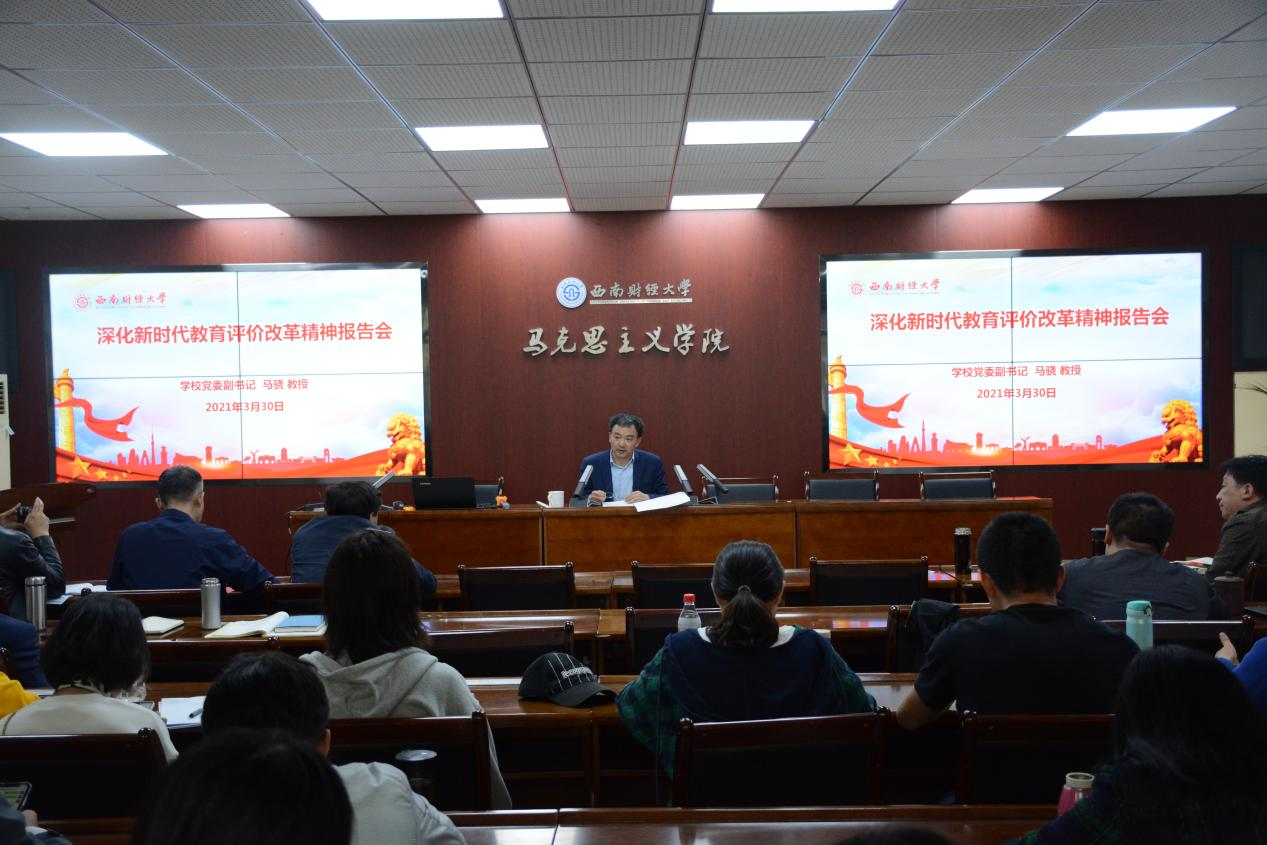 马骁简要介绍了《深化新时代教育评价改革总体方案》(以下简称《总体方案》)出台的背景、过程和意义,以及基本定位、和主要内容,系统阐述、深刻解读了“为什么改、改什么、怎么改”等三方面内容。他指出,《总体方案》是习近平总书记从中国特色社会主义事业后继有人的战略高度和实现中华民族伟大复兴的战略全局作出的重要指示,为深化新时代教育评价改革指明了前进方向、提供了根本遵循。《总体方案》以立德树人为根本任务,坚持政策系统集成、举措破立结合、改革协同推进,提出了与中国教育现代化相适应的改革目标,明确了5个方面22项重点改革任务。他特别指出,马克思主义学院作为四川省“三全育人”综合改革试点院系,要带头贯彻落实党中央和教育部党组要求,以高质量发展为主题,推动教育评价改革要求落地落实,促进学生德智体美劳全面发展。