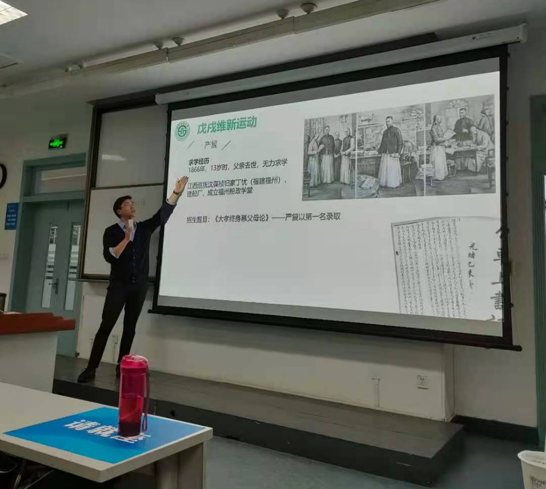 袁上老师此次授课的主要内容是“戊戌维新运动·人物专题”。袁老师首先主讲了“人物专题:康有为”,重点介绍了康有为所代表的清末今文经学派所强调的“变易”思想,这为维新派开风气之先,施行变法图存作了思想、舆论上的氛围营造。接着袁老师通过介绍梁启超的进化论思想,呈现出进化论对近代知识分子的重要意义,进而引出“人物专题:严复”。在讲解了严复个人生平的基础上,带领学生进入严复所翻译的《赫胥黎进化论》原文,探讨严复对“物竞天择”“适者生存”等思想的强调。最后对比参照马克思对社会演化动力的解释,点出“阶级斗争”与社会演变之间的关系,在课程内容上激发了学生的思考。