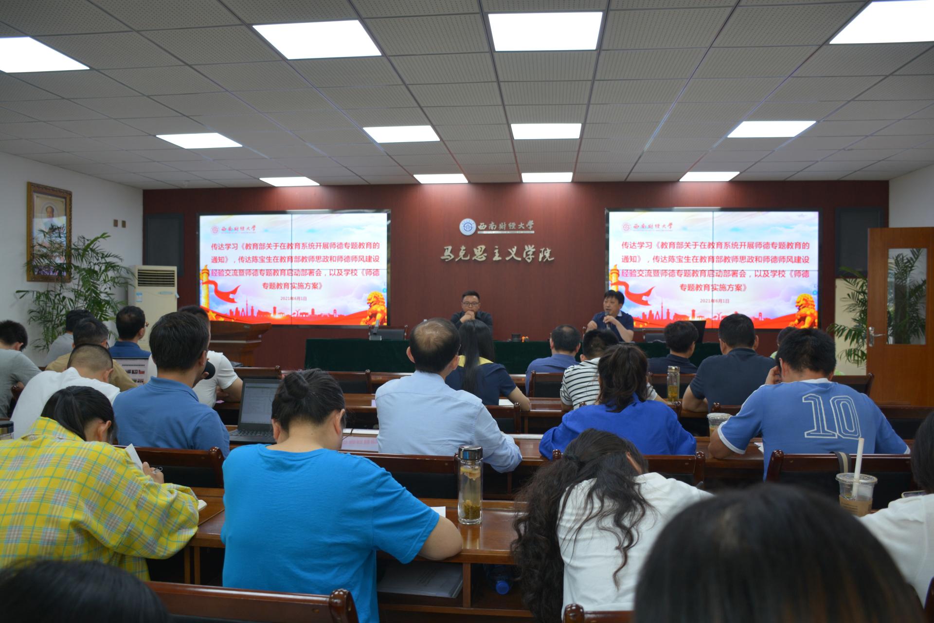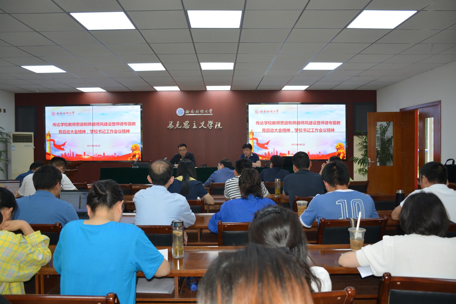 院长唐晓勇传达了《教育部关于在教育系统开展师德专题教育的通知》精神、陈宝生部长在教育部教师思政和师德师风建设经验交流暨师德专题教育启动部署会上的讲话精神,以及学校《师德专题教育实施方案》。唐晓勇指出,过硬的思想政治素质和良好的师德师风是落实立德树人根本任务的前提与保障,加强教师思政工作和师德师风建设意义重大,必须加强组织领导、突出党建引领、坚持统筹推进,发挥思政课“关键课程”和思政课教师“关键教师”的应有作用。唐晓勇还客观分析了当前工作中存在的不足,要求学院教师要对标思政课教师“六要”要求,坚持“四个相统一”、坚持“三个牢固树立”,争做“四有好老师”。