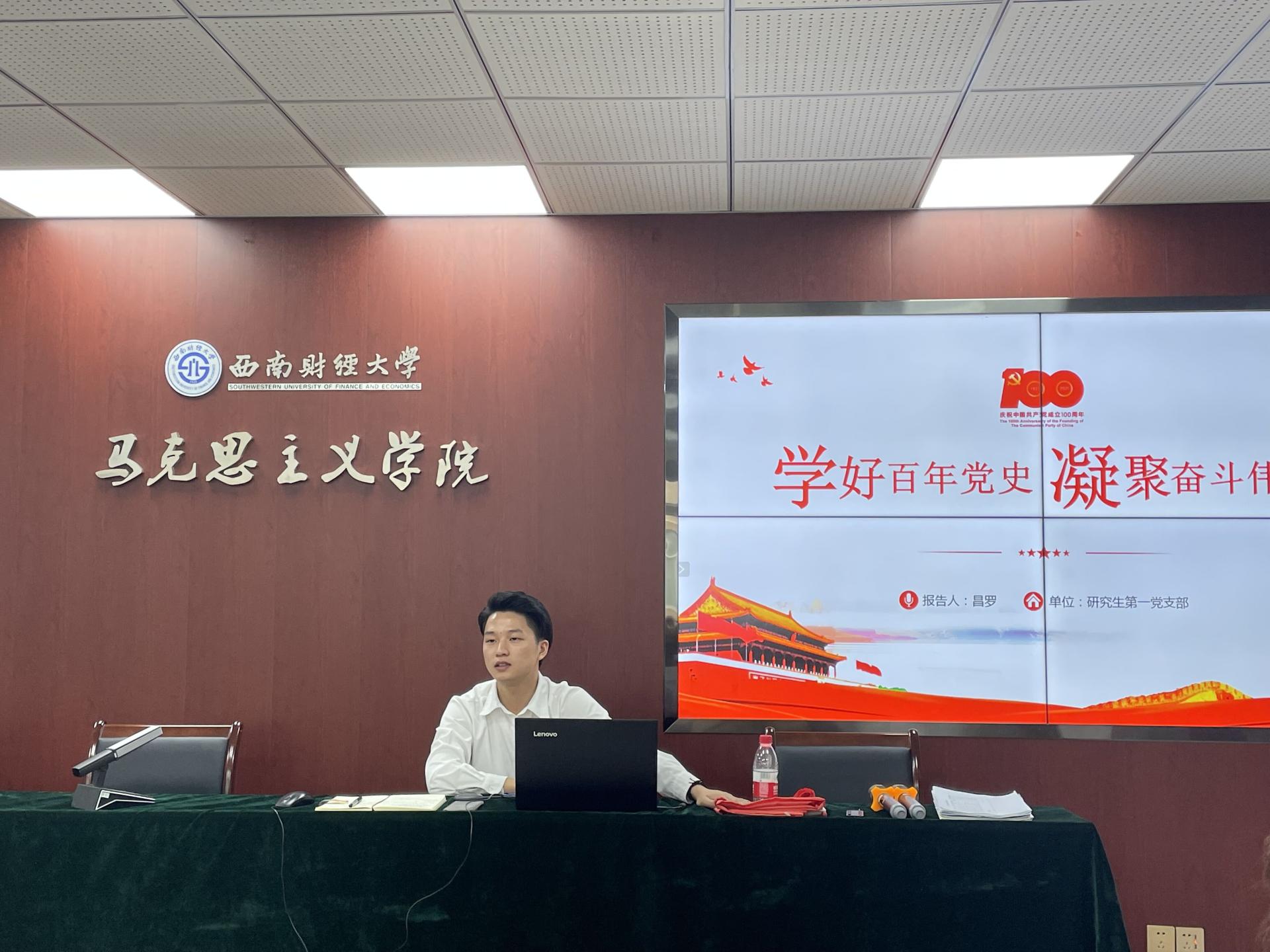 根据学校党委《关于开展党史学习教育的实施方案》及《关于在“七一”前后深入开展“七个一”活动的安排》的部署安排,为深入开展党史学习教育,6月30日上午,马克思主义学院研究生第一党支部书记昌罗以“学好百年党史,凝聚奋斗伟力”为题为支部党员讲授专题党课。研究生第一党支部全体党员、积极分子参加学习。