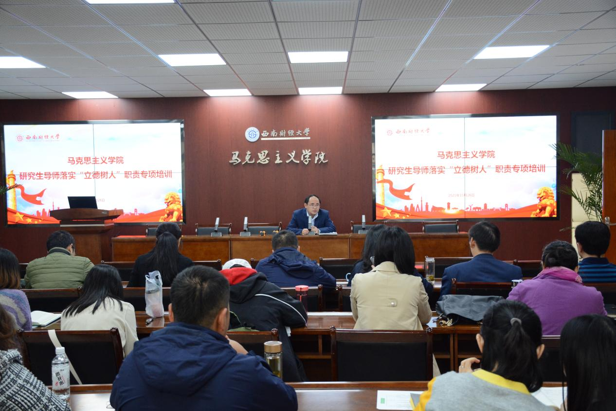 为进一步深化研究生教育改革,加强研究生导师队伍师德师风建设,全面落实研究生导师立德树人职责,2021年10月26日,马克思主义学院副院长刘世强在通博楼A117会议室开展研究生导师“全面落实立德树人职责”专题培训。