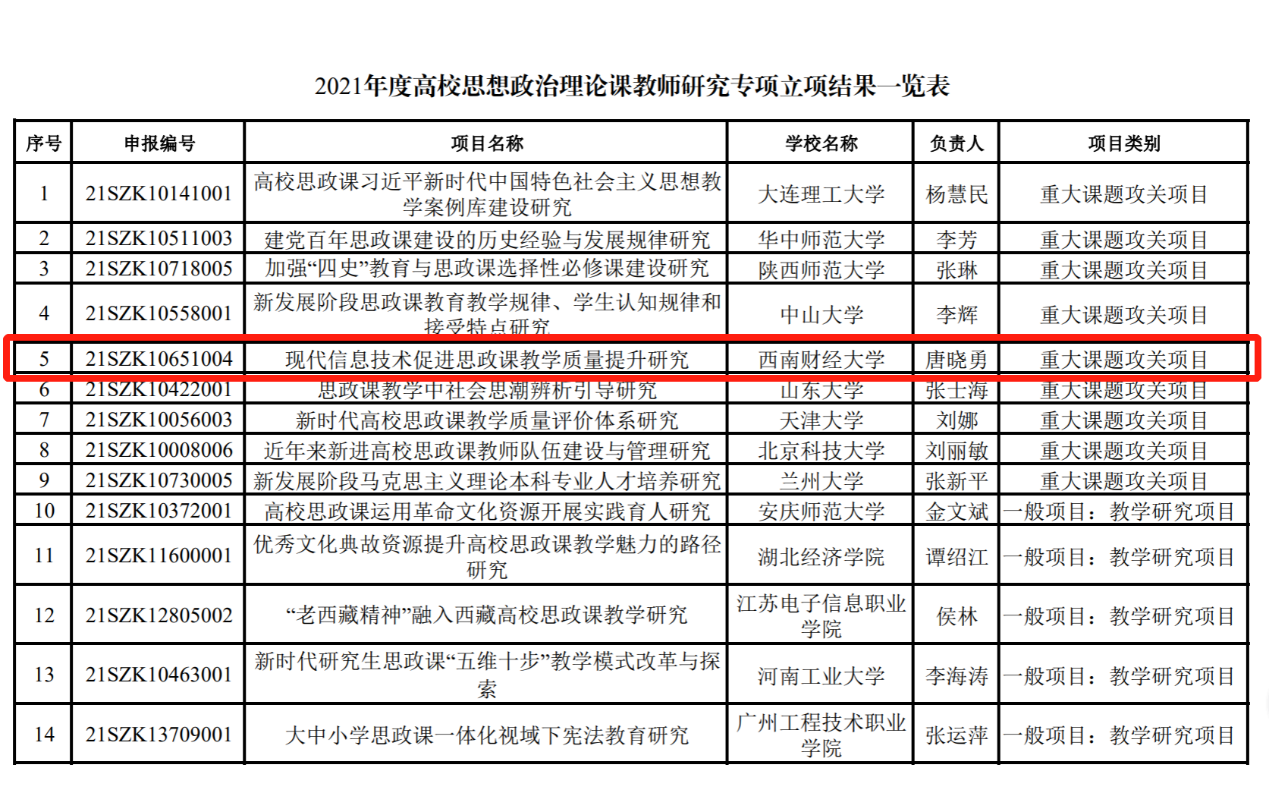 近日,教育部社科司公布了2021年度高校思想政治理论课教师研究专项立项名单,我院院长唐晓勇教授作为首席专家申报的重大课题攻关项目《现代信息技术促进高校思想政治理论课教学质量提升研究》获准立项。
