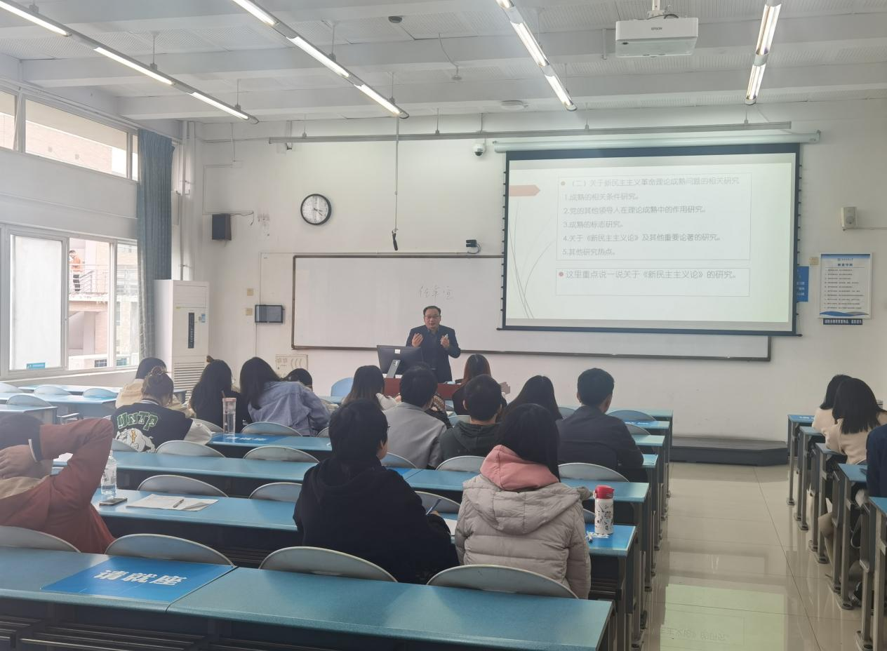 黄世坤老师以“新民主主义革命理论的成熟及相关研究”为主题,重点讲述了“新民主主义革命理论的系统阐述”“关于新民主主义革命理论成熟问题的相关研究”等问题,深入分析了学术界对《新民主主义论》的研究,并结合相关研究引导学生怎样做好研究,最后做了相关研究展望。