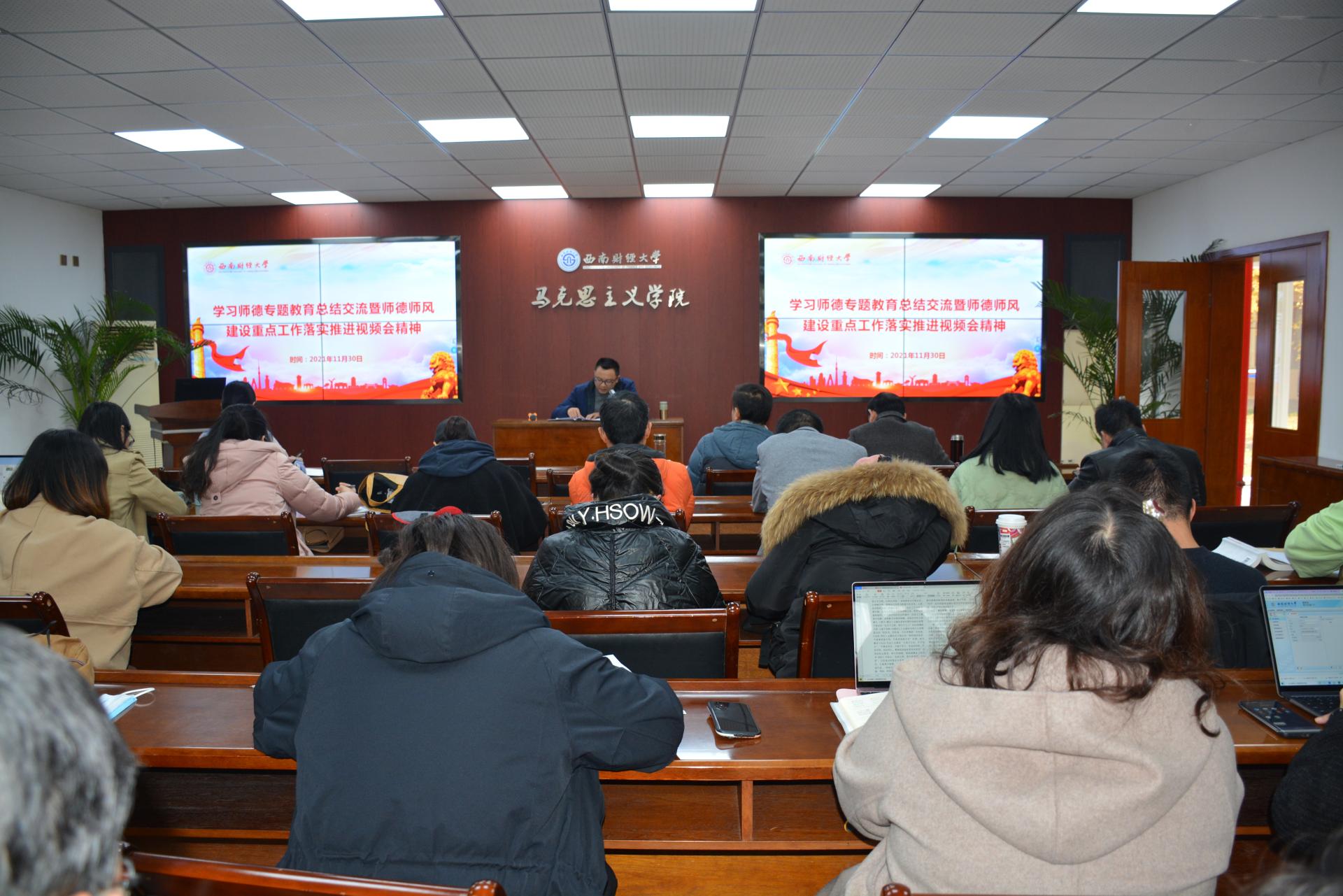 为全面贯彻习近平总书记关于教育的重要论述和教师思想政治及师德师风建设的重要指示精神,深入落实教育部师德专题教育总结交流暨师德师风建设重点工作落实推进会会议精神,11月30日,马克思主义学院在通博楼A117会议室召开教职工政治理论学习会,专题学习教育部相关会议精神,开展师德警示教育。全体教职工参加会议,会议由党总支书记雷栋良主持。