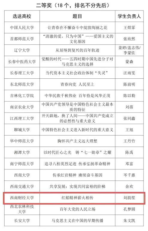 近日,由教育部高校思想政治理论课教学指导委员会主办、南开大学马克思主义学院承办的“百年辉煌路.奋斗正当时”——第五届全国高校大学生讲思政课公开课展示比赛圆满结束,我院2020级马克思主义中国化专业硕士研究生刘韵笙同学主讲作品《红船精神薪火相传》荣获全国二等奖。