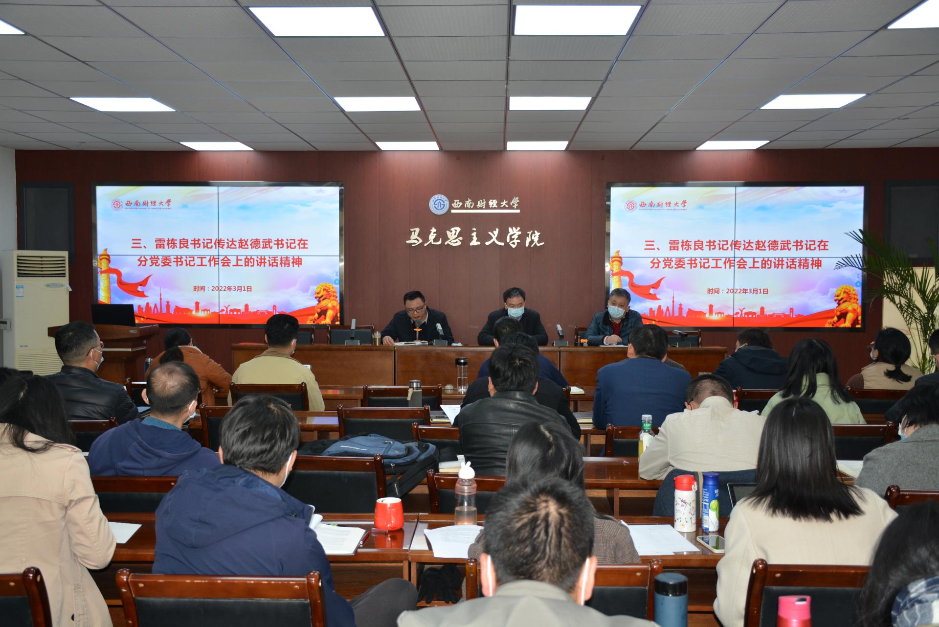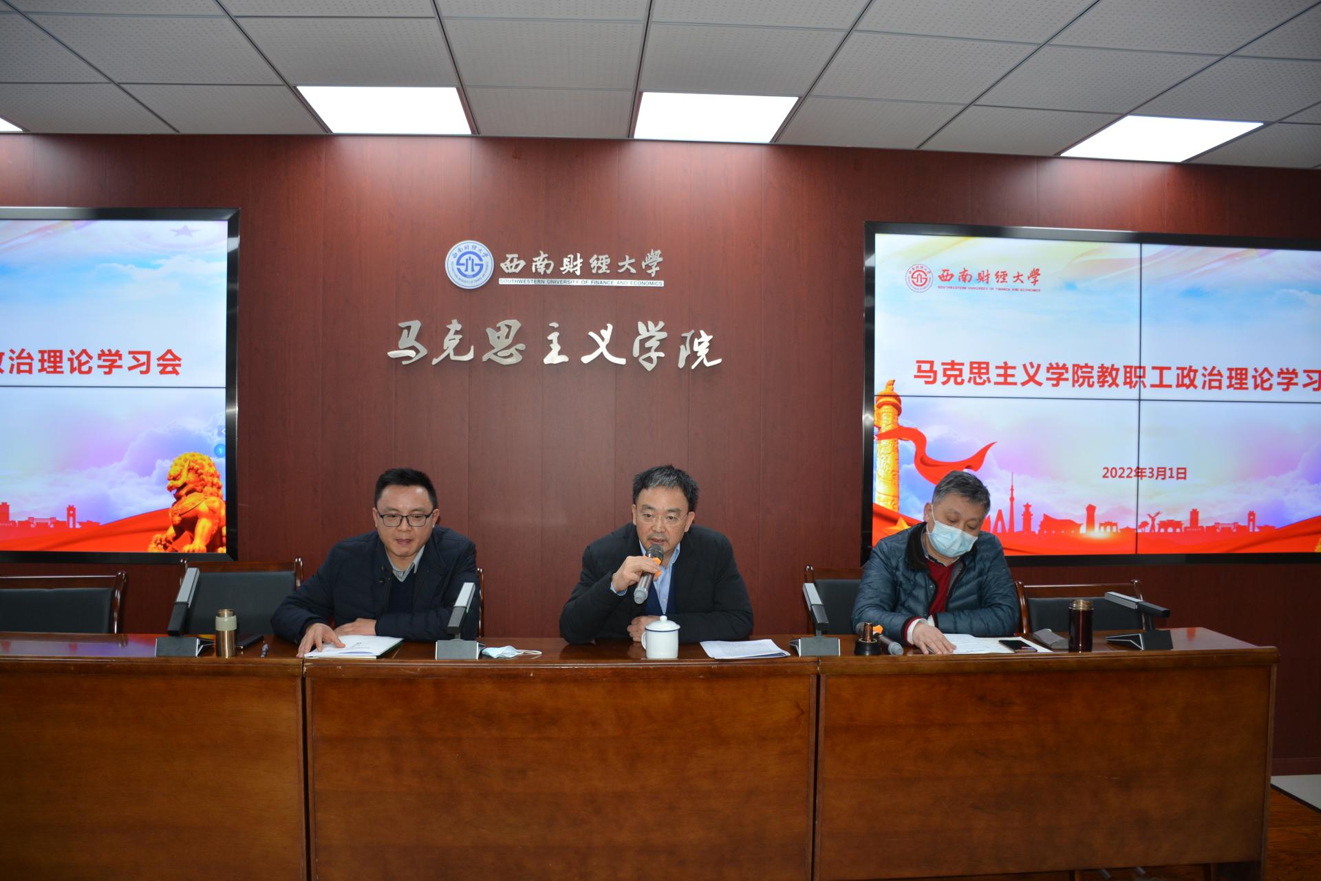2022年3月1日,马克思主义学院在通博楼A117会议室召开教职工政治理论学习会,创新方式研学习近平总书记在省部级主要领导干部专题研讨班上重要讲话精神,传达学习学校院级党组织书记工作会精神。学校党委副书记马骁出席会议并讲话,全体教职工参加会议。院长唐晓勇主持会议。