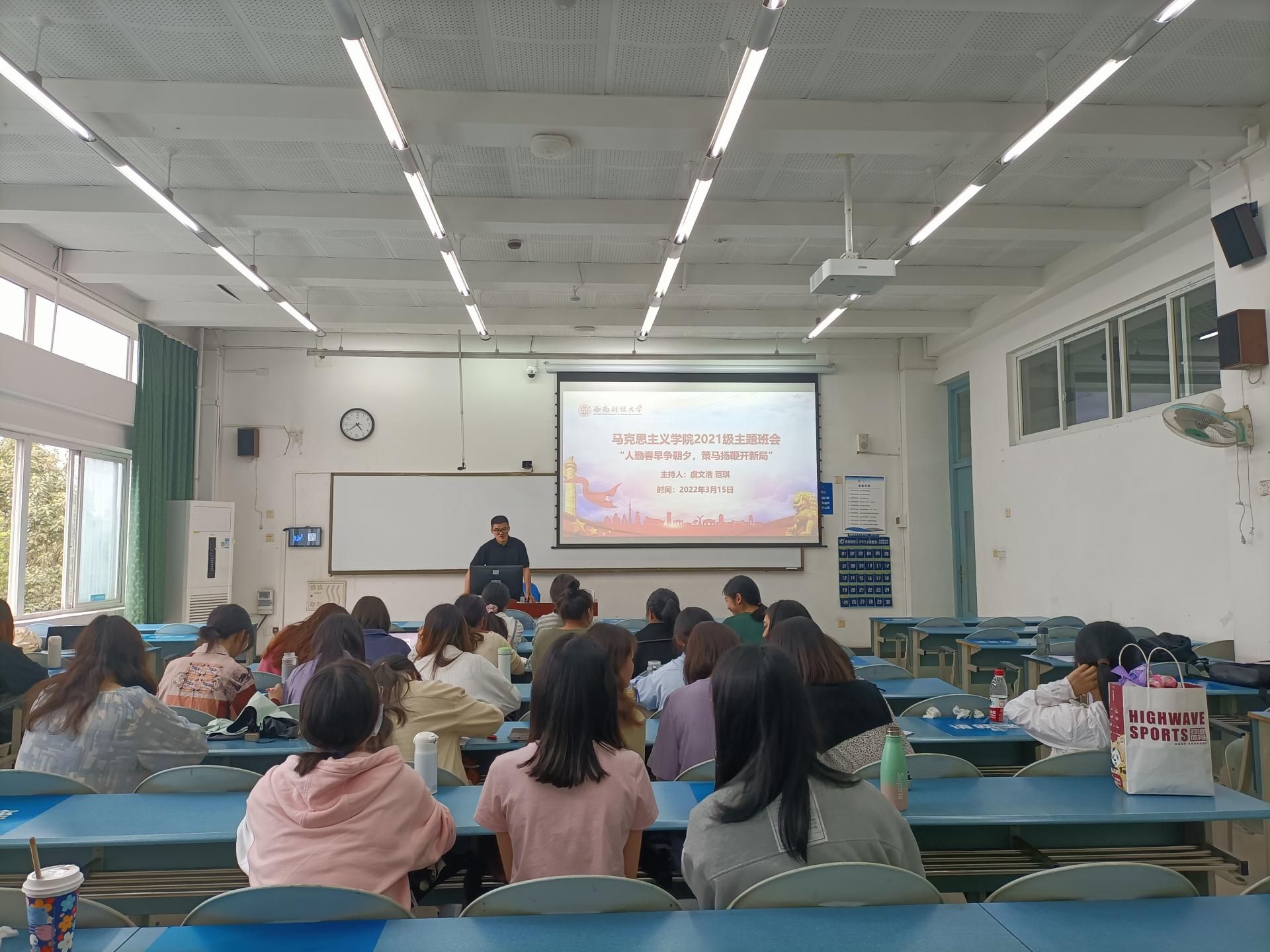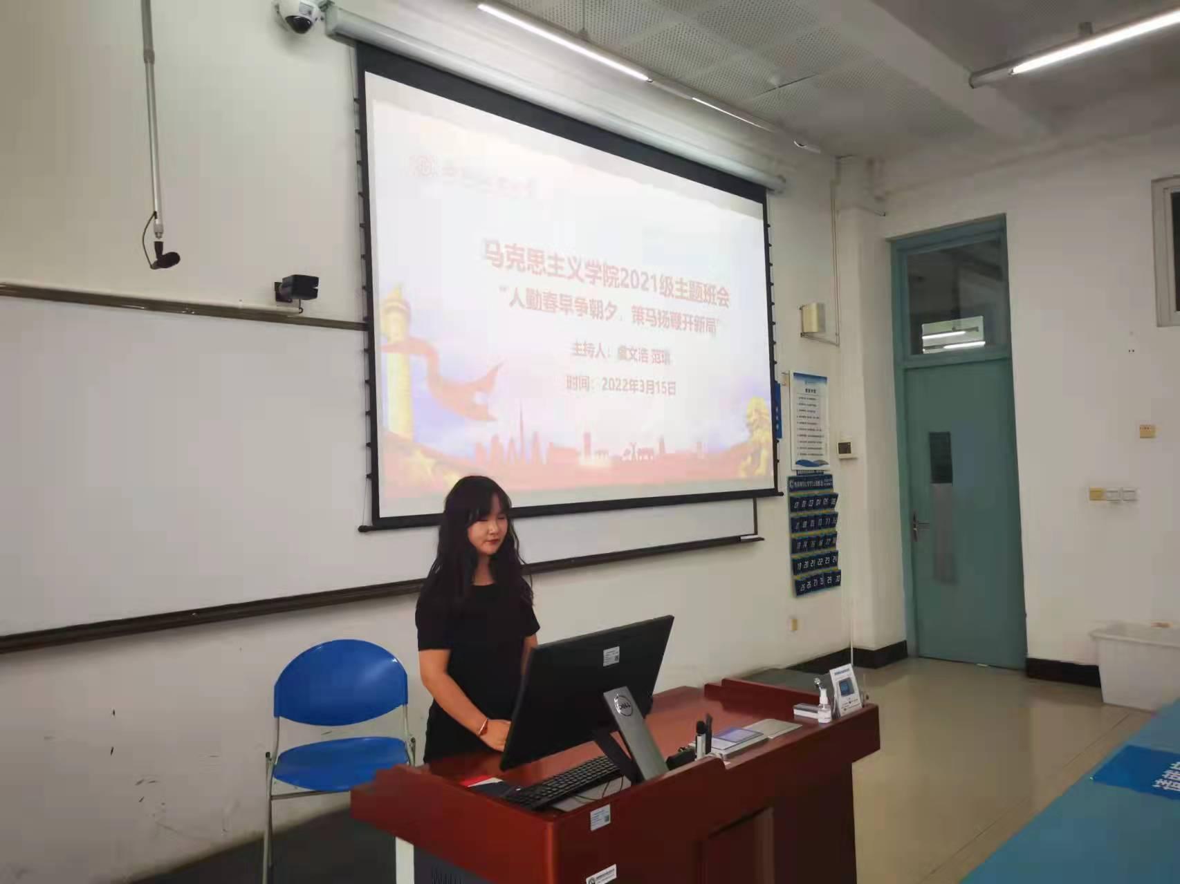 为促进同学们树立清晰目标,明确奋斗方向,落实疫情防控工作,马克思主义学院2021级班级团支部于2022年3月15日在颐德楼403教室组织召开“人勤春早争朝夕,策马扬鞭开新局”的主题团日活动,本次活动由班长虞文浩、范琪主持,班级全体同学参加。