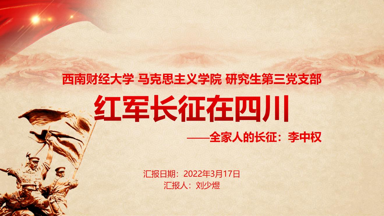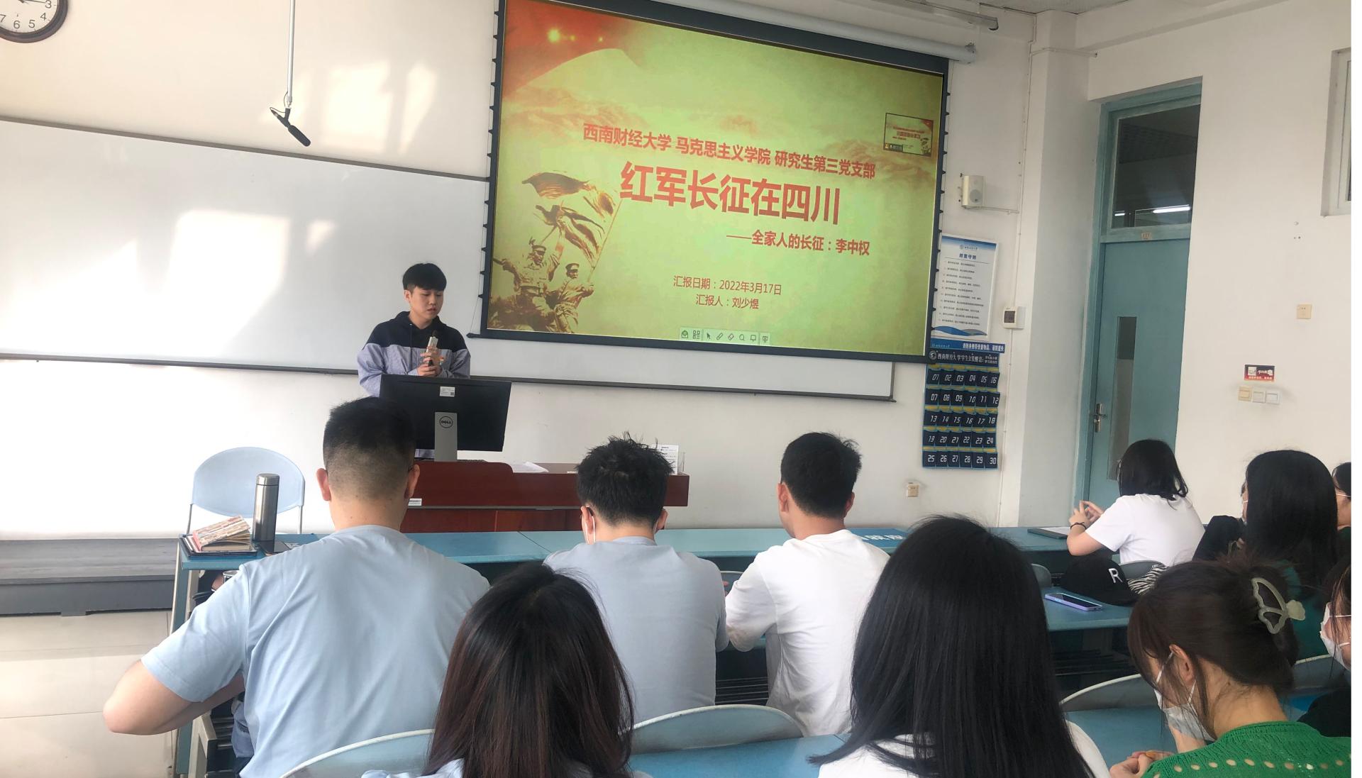 为创新开展党史学习教育实践路径,激发高校大学生对党史学习的主动性、积极性,2022年3月17日,马克思主义学院党总支研究生第三党支部在颐德楼H506开展“红军长征在四川”第二次党史学习教育特色活动。本次党史学习教育由马克思主义学院党总支研究生第三党支部书记袁可心主持,由支部党员刘少煜主讲,支部全体党员和入党积极分子参加。