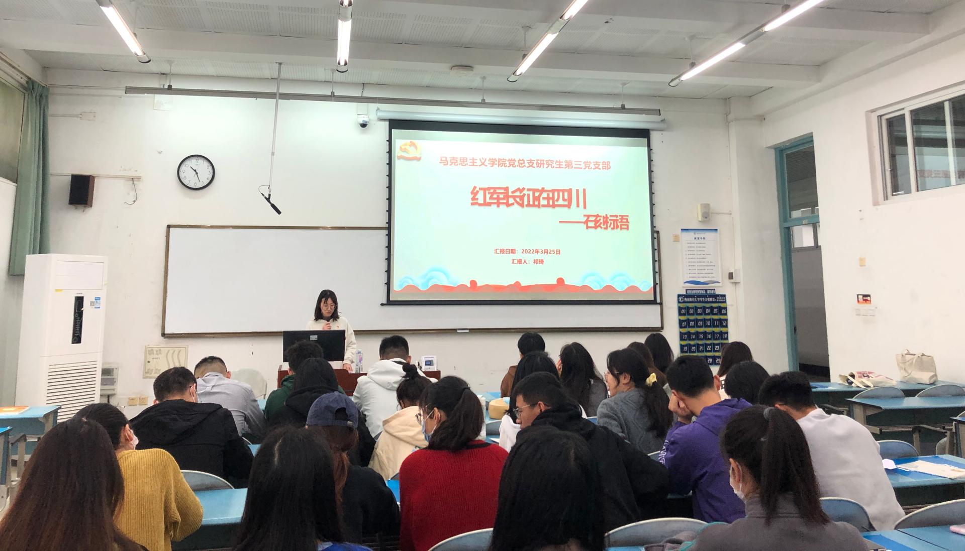 学习历史使人明心,学习精神催人奋进。为了拓展党史学习教育路径、创新党史学习方式,充分调动高校大学生对党史学习的主动性、积极性,2022年3月25日,马克思主义学院党总支研究生第三党支部在颐德楼H206开展“红军长征在四川”第三次党史学习教育特色活动。本次党史学习教育由马克思主义学院党总支研究生第三党支部书记袁可心主持,由支部党员祁琦主讲,支部全体党员参加。