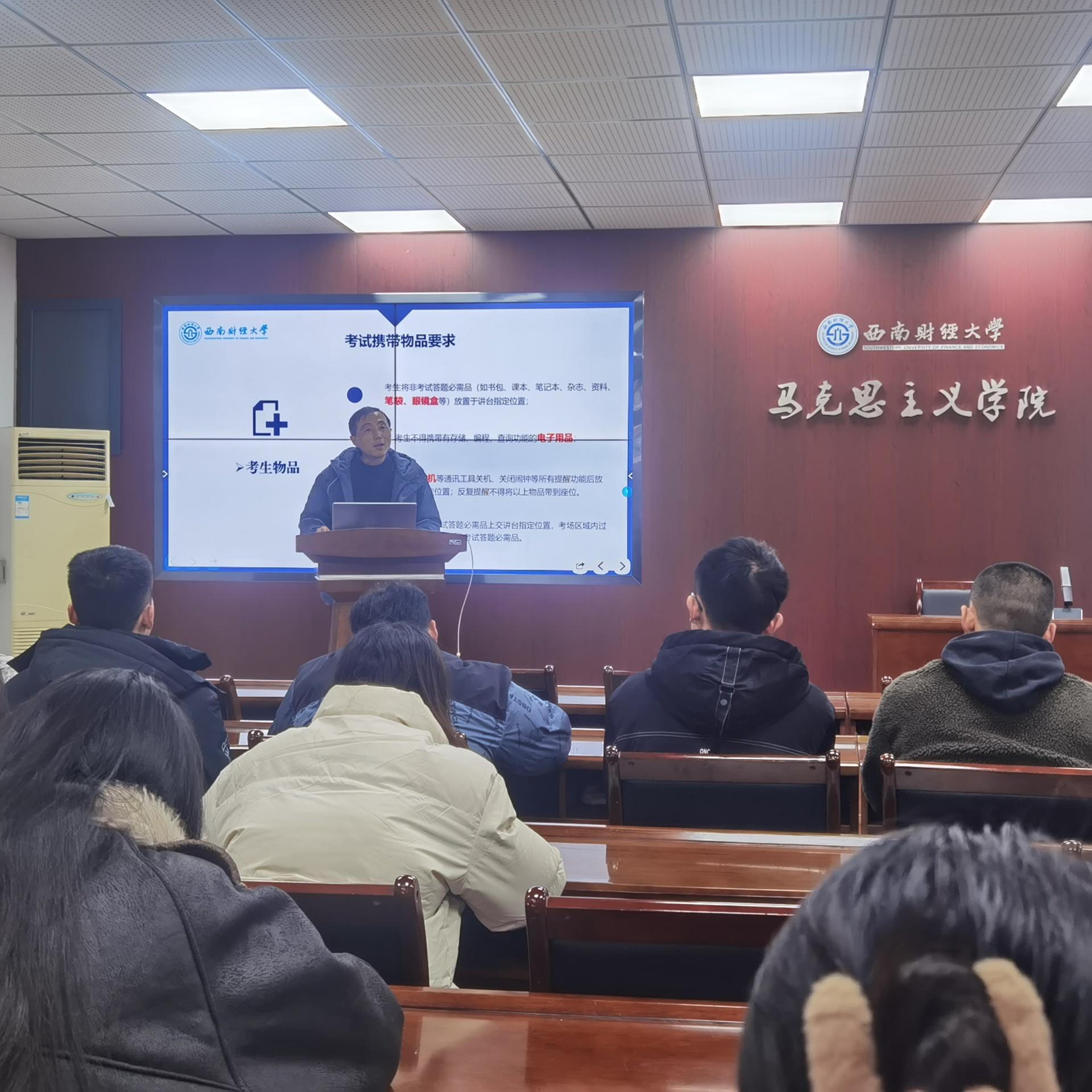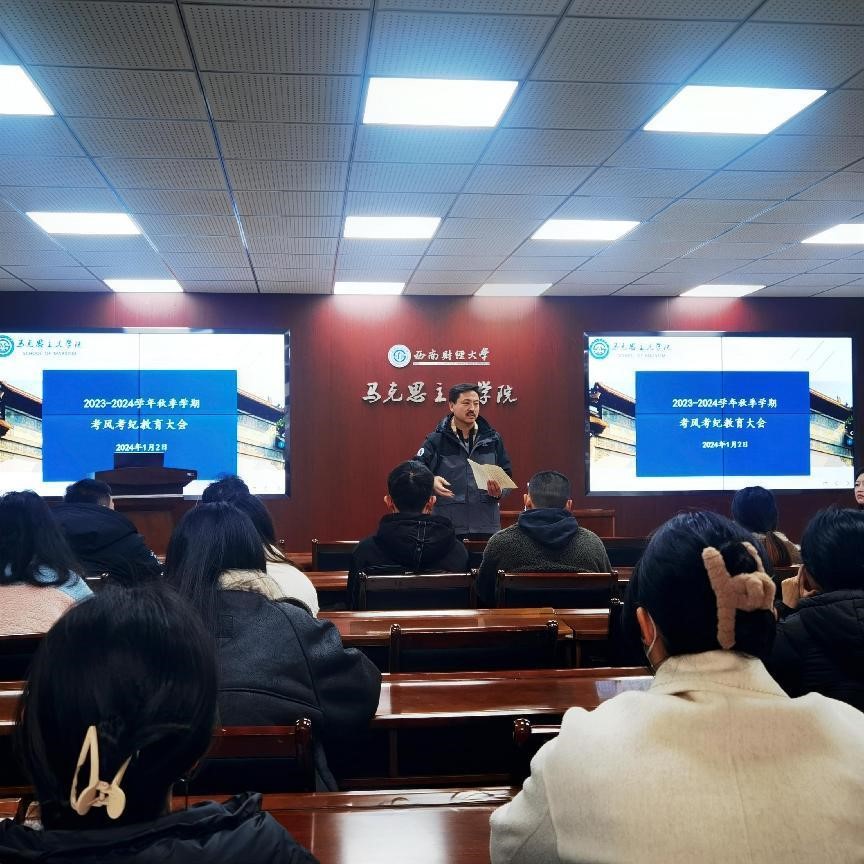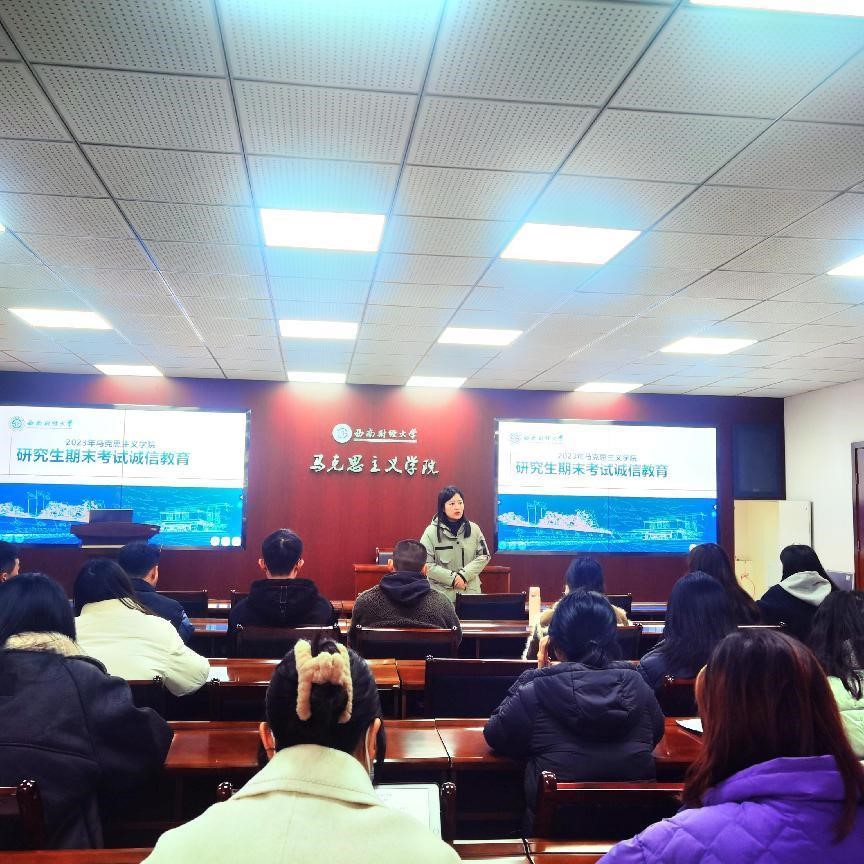 为进一步严肃考风考纪,引导学生诚实守信,保障期末考试工作平稳有序进行。2024年1月2日下午,马克思主义学院在通博楼A117会议室召开考风考纪诚信教育大会。学院副院长吴玉平、学院党委副书记、纪委书记钟芸莹、辅导员王磊老师及全体研究生参加会议。