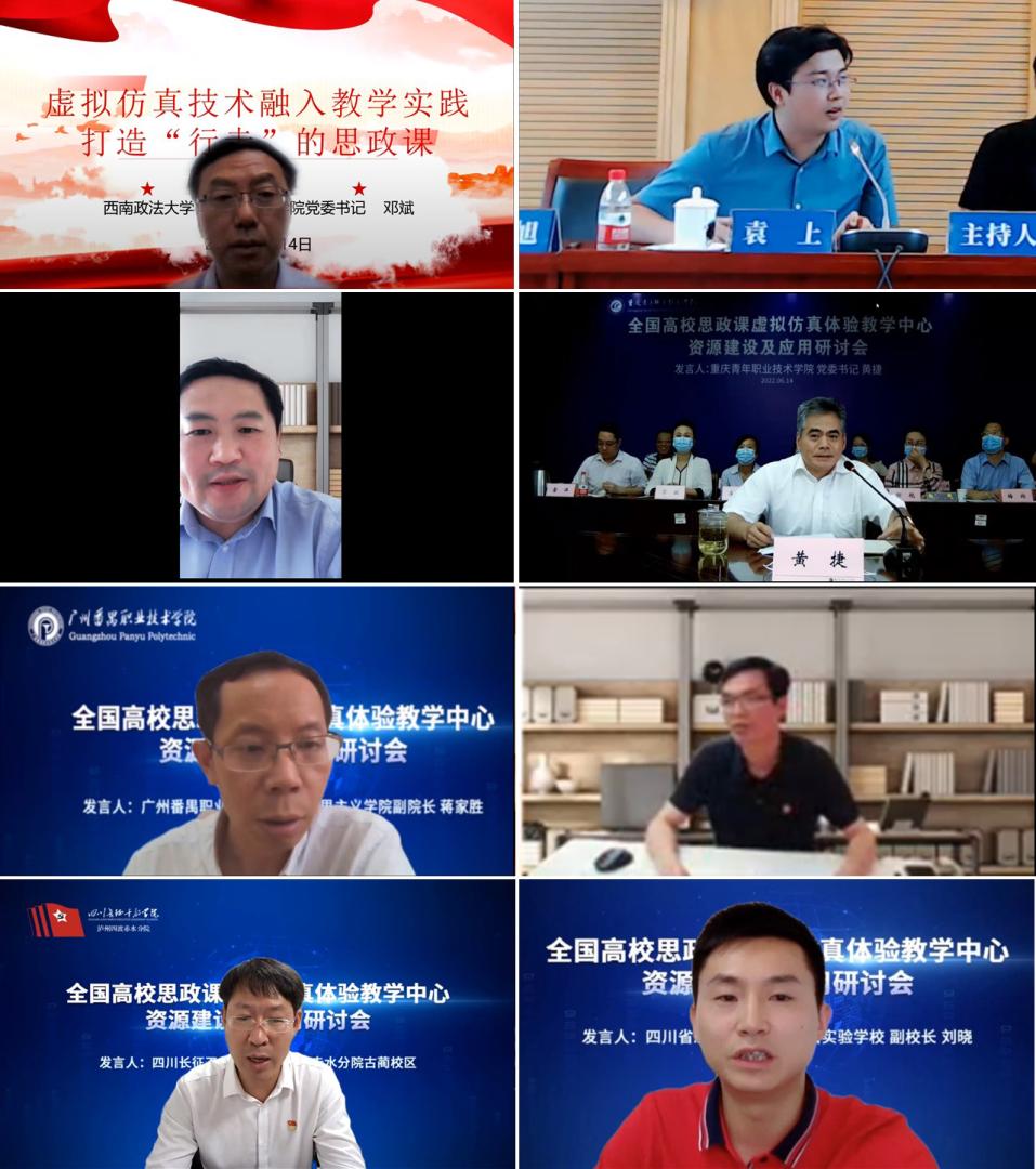 在交流发言环节,来自西南财经大学、电子科技大学、西南政法大学、重庆青年职业技术学院、广州番禹职业技术学院、成都职业技术学院、四川长征干部学院四渡赤水分院、四川省金阳县东山实验学校的代表分别立足本单位特色,从方案设计、资源建设、团队建设和品牌建设等方面详细介绍了本单位深入推进思政课虚拟仿真项目建设和推广的经验做法。