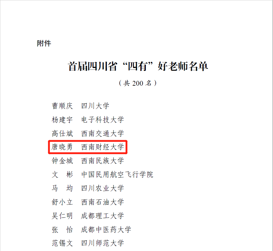 为大力宣传和热烈庆祝第38 个教师节,充分展示新时代人民教师教书育人的动人风采和先进事迹,进一步营造全社会尊师重教的浓厚氛围,不断激励广大教师以实际行动迎接党的二十大胜利召开,中共四川省委教育工委、四川省教育厅开展首届四川省“四有”好老师遴选工作,经过民主推荐、严格把关、层层遴选,我院院长唐晓勇教授及全省共 200名从事教育教学工作的同志被评为首届四川省“四有”好老师。