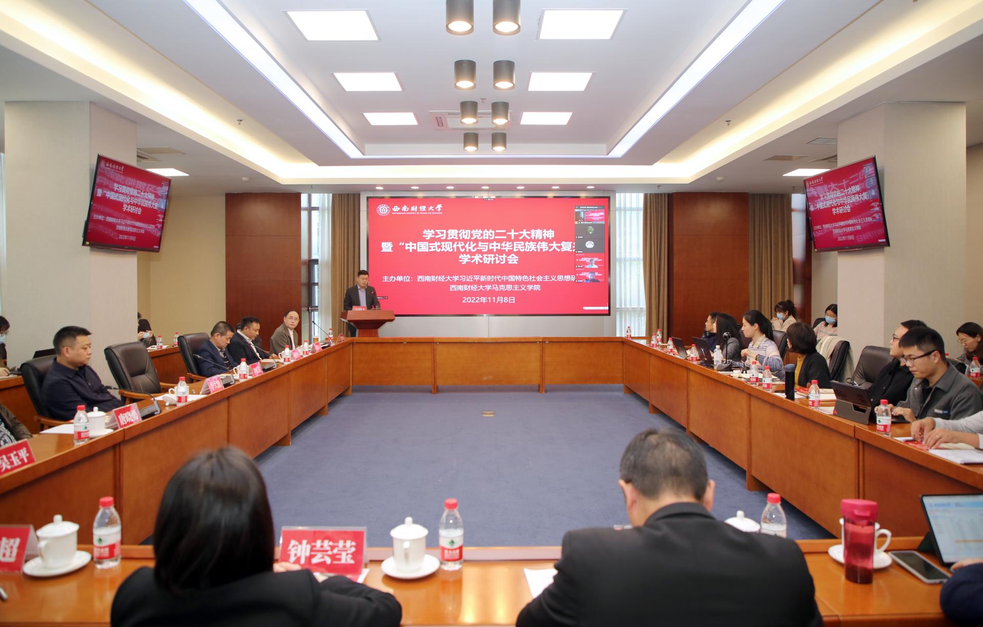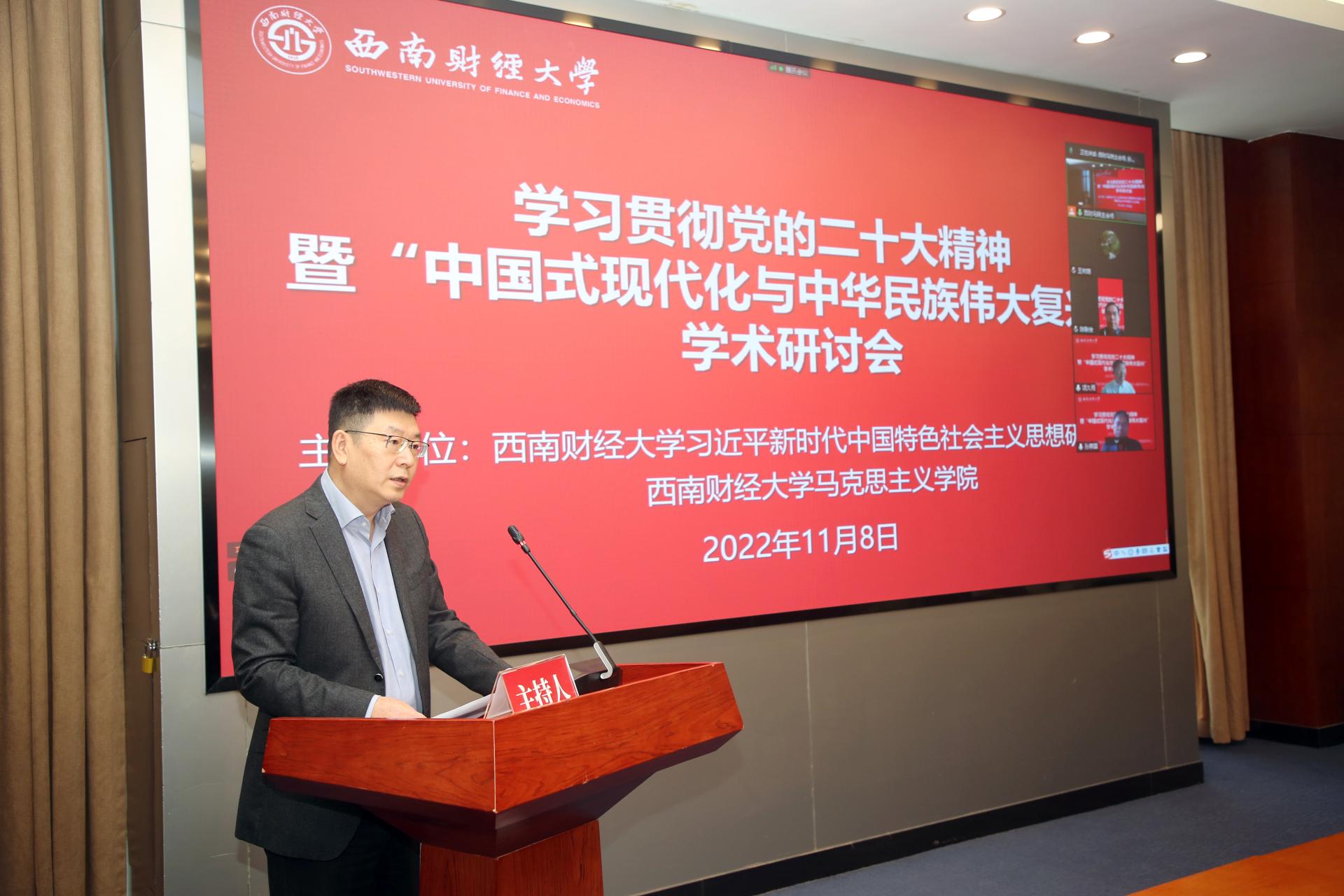 为深入学习贯彻党的二十大精神,由西南财经大学习近平新时代中国特色社会主义思想研究中心、西南财经大学马克思主义学院主办的学习贯彻党的二十大精神暨“中国式现代化与中华民族伟大复兴”学术研讨会于11月8日在学校举行。来自北京大学、清华大学、北京师范大学、复旦大学、武汉大学等近20位知名专家学者参加本次研讨会。学校党委常委、副校长尹庆双教授,教育厅宣传思想与统战工作处处长李大鹏,学校党委宣传部、科研处等部门负责人和马克思主义学院领导班子、教授委员会成员及部分师生参加本次研讨会。马克思主义学院党委书记雷栋良主持开幕式。