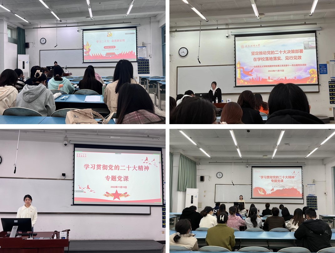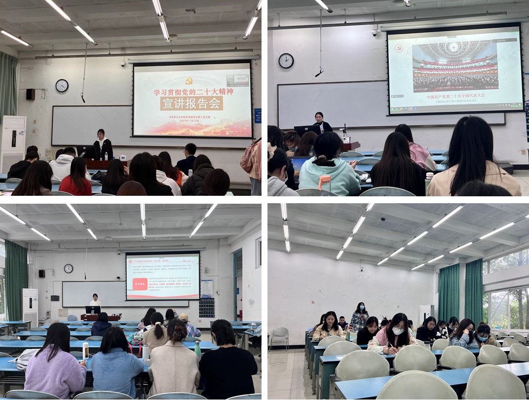 盛会凝聚人心,蓝图催人奋进。党的二十大召开至今,马克思主义学院师生学习热情持续高涨、学习内容不断深入、学习形式不断丰富。为深入学习宣传贯彻党的二十大精神,2022年11月15日,马克思主义学院各研究生党支部在颐徳楼开展支部书记讲党课活动,学院全体研究生党员参加学习。