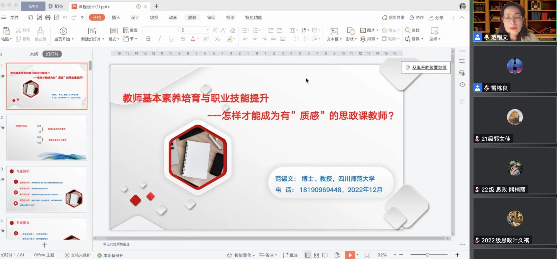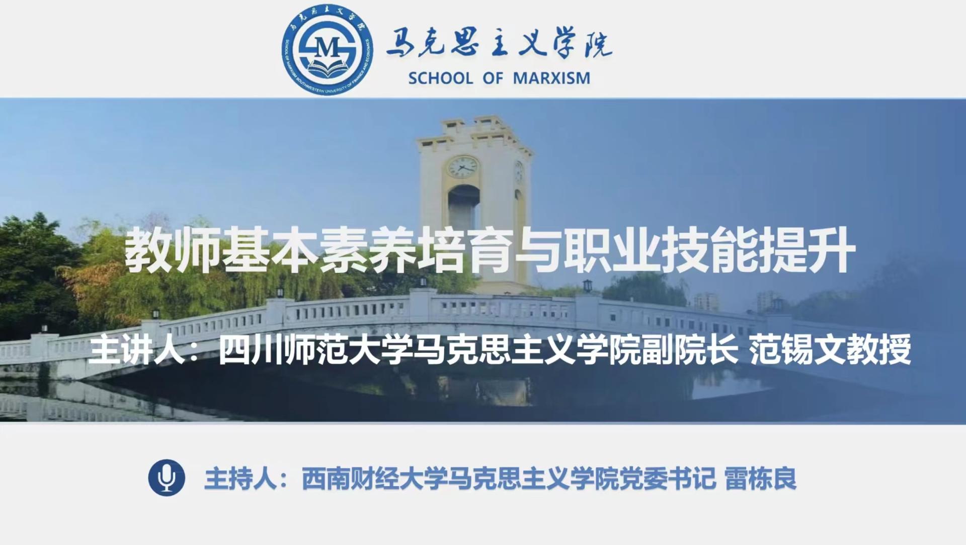 为深入学习贯彻党的二十大精神,切实回应学院学习生活空间恳谈会上同学们关注的重大需求,强化学生就业择业指导帮扶,帮助同学们做好教师岗位求职准备,11月27日晚,马克思主义学院特邀四川师范大学马克思主义学院副院长范锡文教授作线上专题讲座,讲座主题为“教师基本素养培育与职业技能提升——怎样才能成为有‘质感’的思政课教师”。学院党委书记雷栋良主持讲座,100余名同学线上聆听讲座。