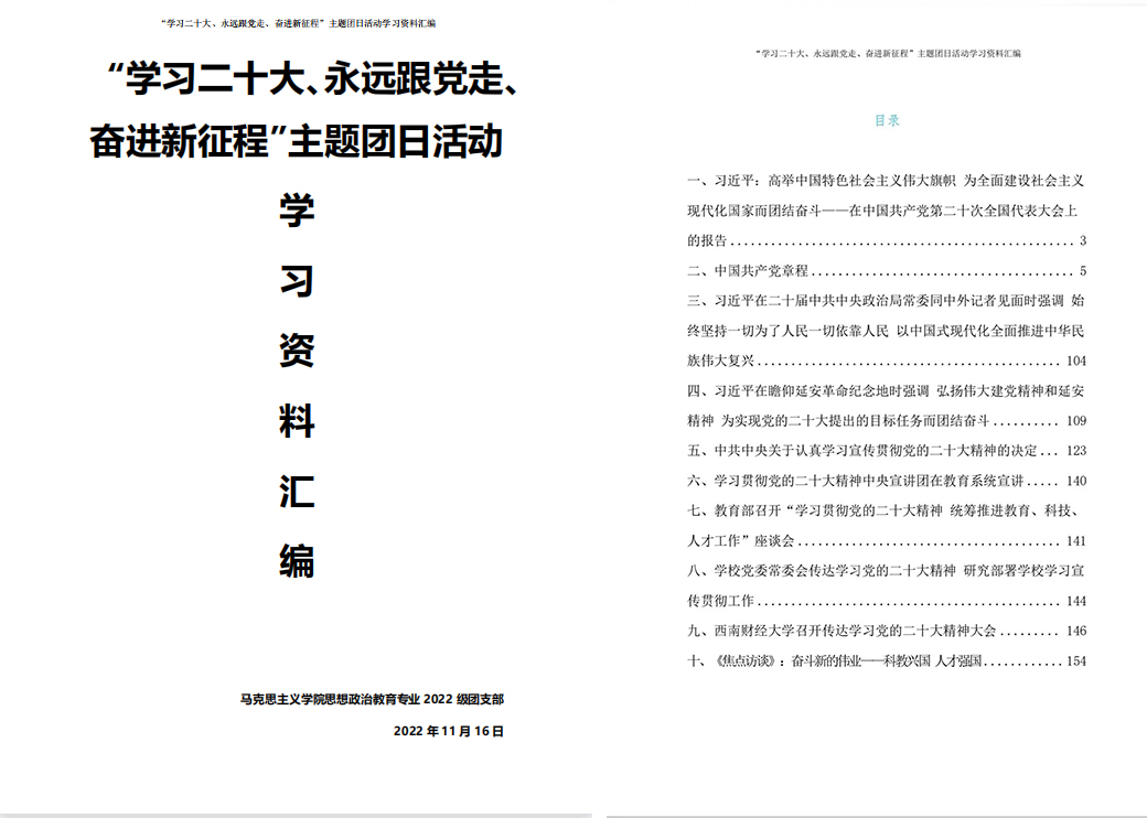 马克思主义学院2022级团支部团支委围绕“学习二十大、永远跟党走、奋进新征程”主题编辑汇总相关学习资料。全体团员立足学习资料,通过党员带头学、小组学习、班级集体学习等多种形式,深入学习贯彻习近平新时代中国特色社会主义思想,贯彻落实党的二十大精神。在全体团员集体学习环节,团支部书记廖悦婷带领全体团员学习了党的二十大报告,重点对“十年伟大跨越”“五个必由之路”“六个必须坚持”等内容进校深入学习。通过积极开展交流讨论学习,既促使支部团员深入学习创新理论,把握党的二十大精神,又增强了团支部的凝聚力。