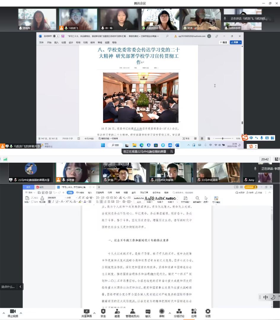 2022年10月16日,中国共产党第二十次全国代表大会在北京顺利召开。为了深入学习贯彻党的二十大精神,推动二十大精神学习往深里走、往实里走、往心里走,进一步引导学院团员青年统一思想、凝聚共识,切实增强团员的政治意识、组织意识和模范意识,加强新时代团的基层组织建设,马克思主义学院2022级团支部开展“学习二十大、永远跟党走、奋进新征程”的线上主题团日活动。