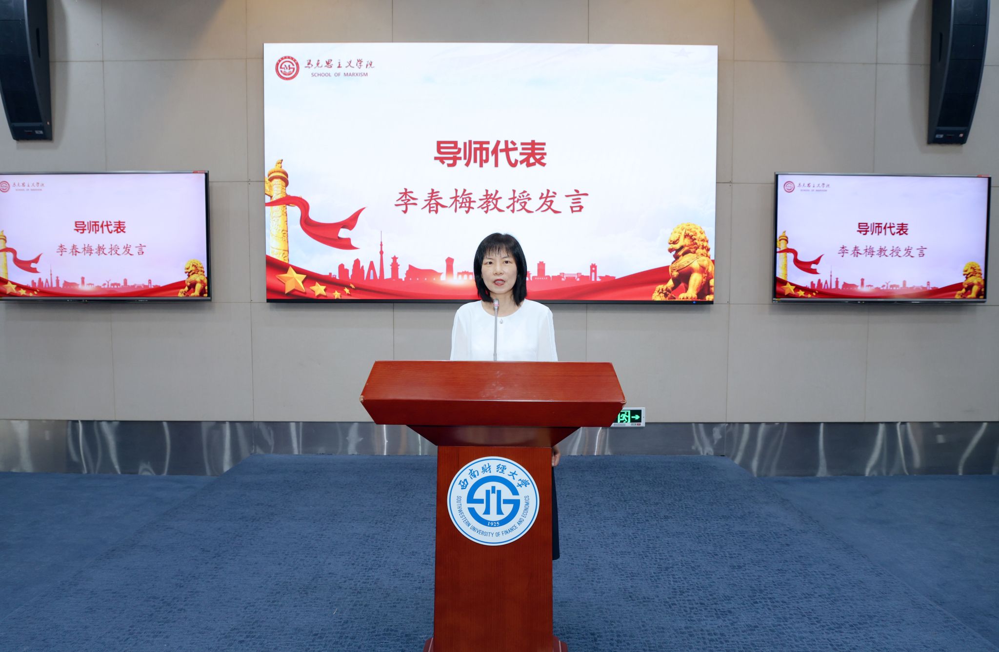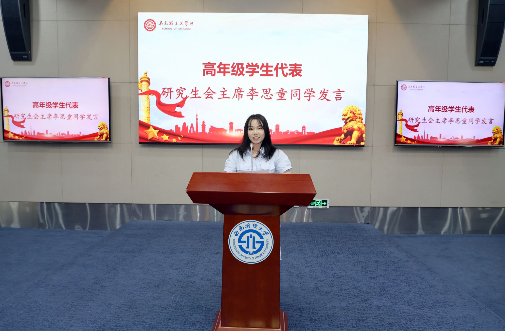 随后,导师代表李春梅教授勉励同学们多读、多思、多练,同时勤省、勤悟、勤勉,把握自己、把握当下、把握时代脉搏。高年级学生代表、研究生会主席李思童回顾了自己在西财马院两年的求学经历,分享了在校感悟和学习心得。新生代表邢蕊则表达了对未来研究生生活的憧憬和展望,以修身修德、明确目标、夯实基础与全体新生共勉。