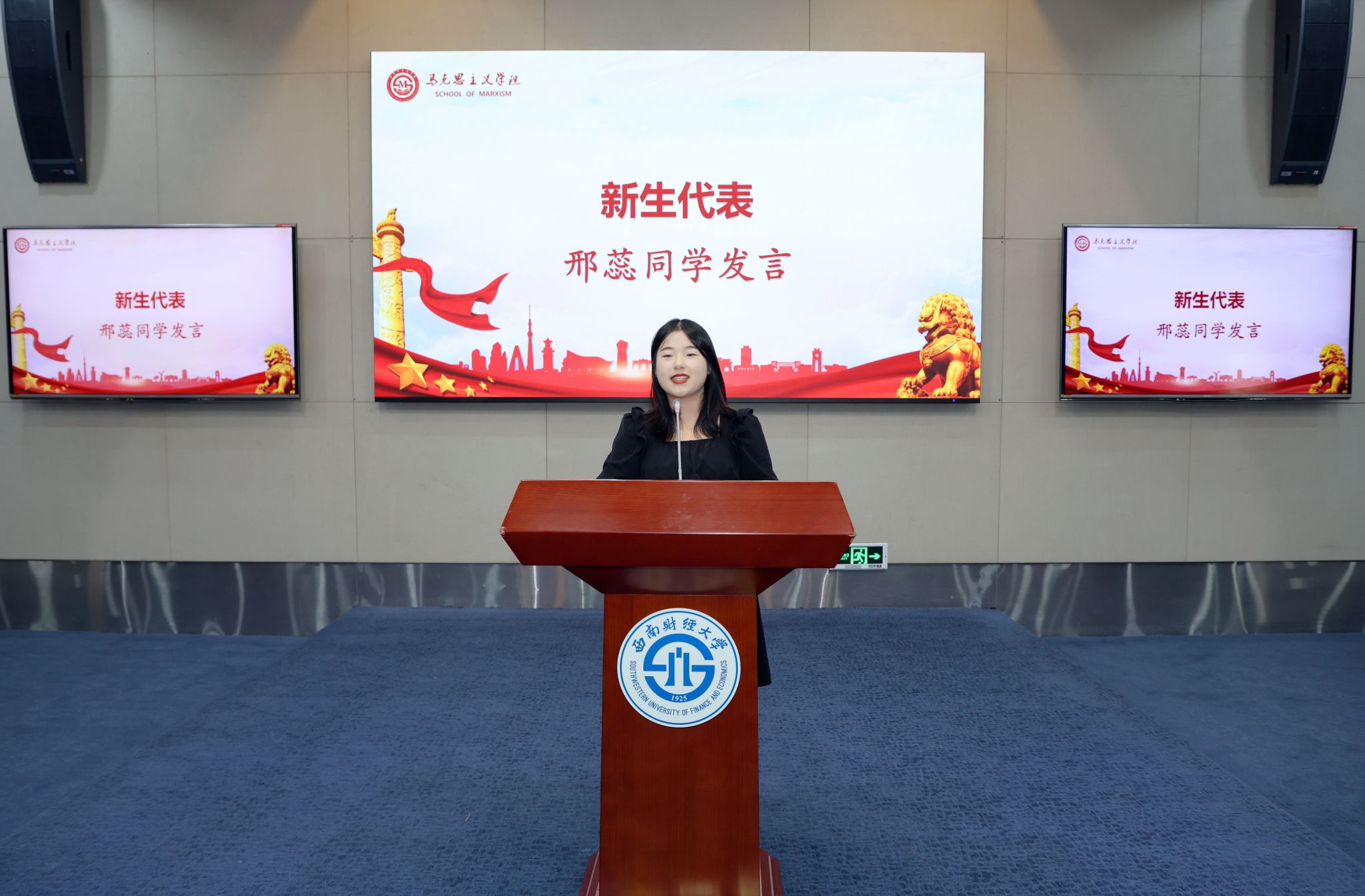 典礼伊始,学院师生共同观看了《使命·荣光——马克思主义学院建院20周年宣传片》。学院院长唐晓勇教授代表学院祝贺2024级全体新生圆梦西财,并介绍了学院的发展历程、学科架构、课程设置以及平台搭建情况。在题为《立德、立功、立言:努力做马克思主义的传播者》的致辞中,唐晓勇对全体新生提出了三点殷切期望:一是立德为先,树牢理想信念,做到德厚自信、修身载物。二是立功为向,树立立功之志,做到自强功成、守正创新。三是立言为恒,敢于和善于立言,做到言以自觉、泽被于世。他勉励同学们求真理、明事理、悟道理,做一名有为的西财马院人,在促进马克思主义科学真理的传播教育和研究阐释中建功立业。
