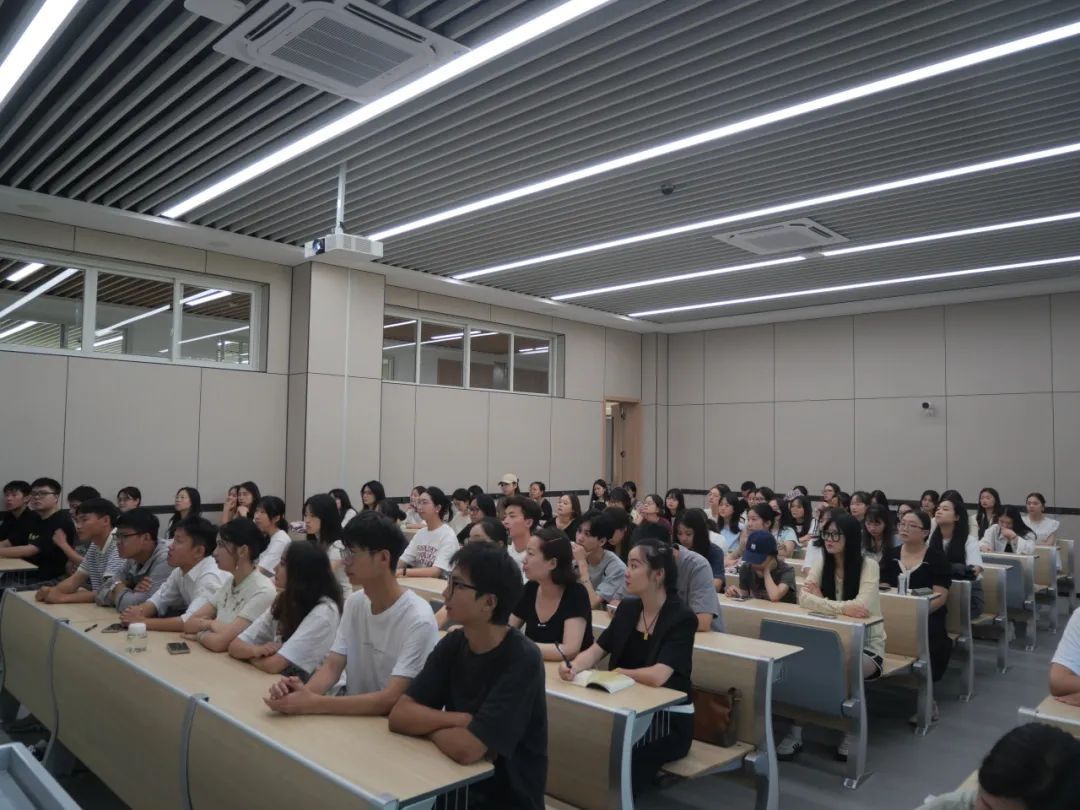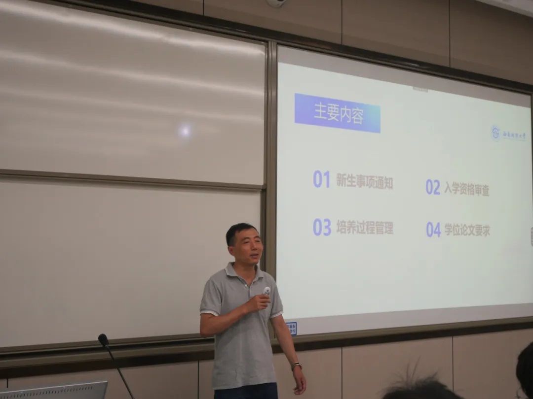 钟芸莹传达了学校关于新生入学教育相关要求,向新生通报了近期安排,强调严格遵守校规校纪,按时完成入学教育,鼓励大家积极参与学生工作和学院建设,希望大家做到安全第一、纪律为先、学习为主、全面发展,并对大家未来的研究生生活给予真诚祝愿。王磊就新生入学重要事项、入学资格审查、培养过程管理、奖励资助体系、安全防诈防骗等内容展开详细说明,并希望大家对未来充满信心,做好充分准备,安全愉快地度过校园生活、顺顺利利地完成学业。