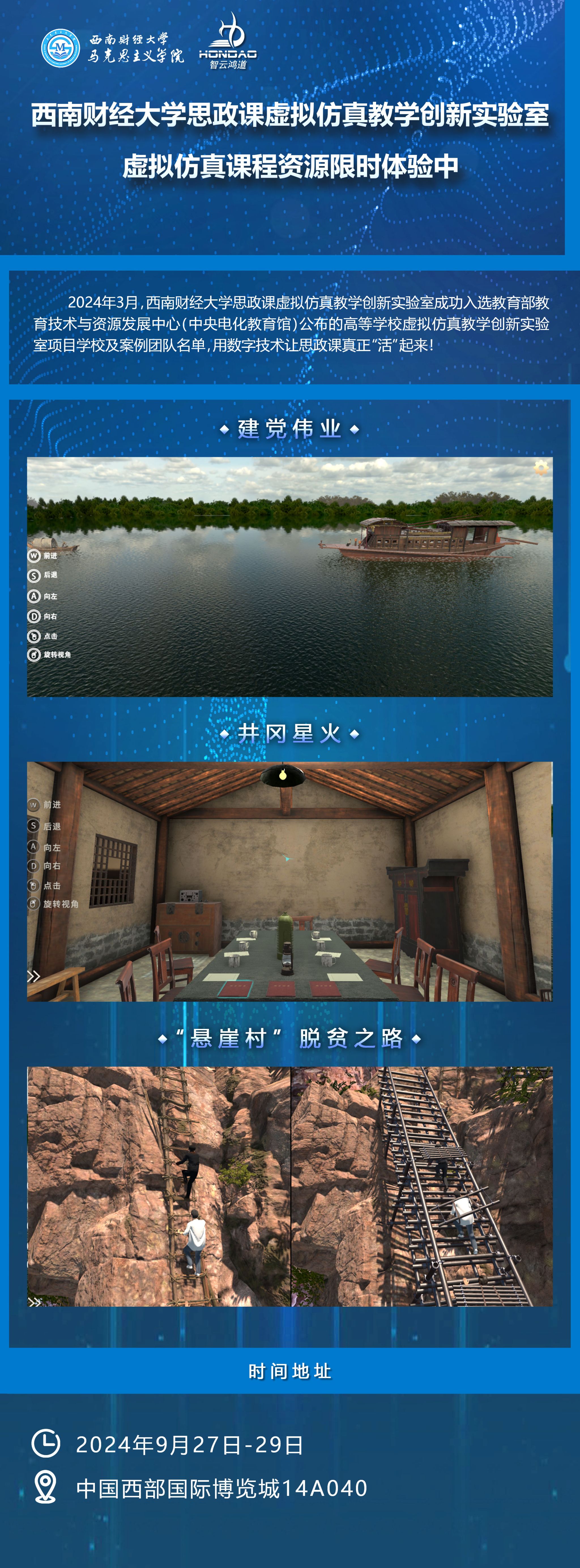 据悉,本届教博会持续到29日。活动期间,西南财经大学思政课虚拟仿真教学创新实验室热忱欢迎广大兄弟院校前来实地考察、交流学习,共同以高质量的思政虚拟仿真实验教学让思政课可感可触、直观生动。
