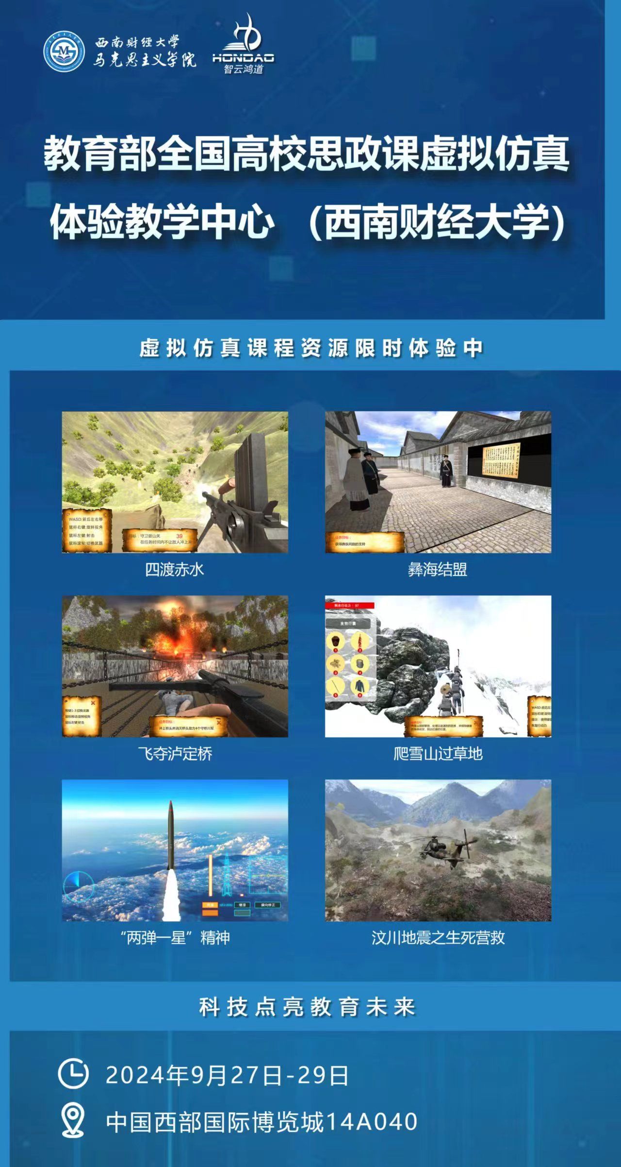 西南财经大学思政课虚拟仿真教学创新实验室及案例团队作为教育部教育技术与资源发展中心(中央电化教育馆)公布的高等学校虚拟仿真教学创新实验室项目学校及案例团队,在展会现场为参会嘉宾准备了超多干货,全景展示了创新实验室建设内容、建设经验、建设成果和应用成果,现场还展出了由教育部全国高校思政课虚拟仿真体验教学中心(西南财经大学)出品、马克思主义学院与成都智云鸿道有限责任公司共同研发的飞夺泸定桥、四渡赤水、“两弹一星”精神等9项思政虚拟仿真实验项目,成为本次展会不容错过的一大亮点。