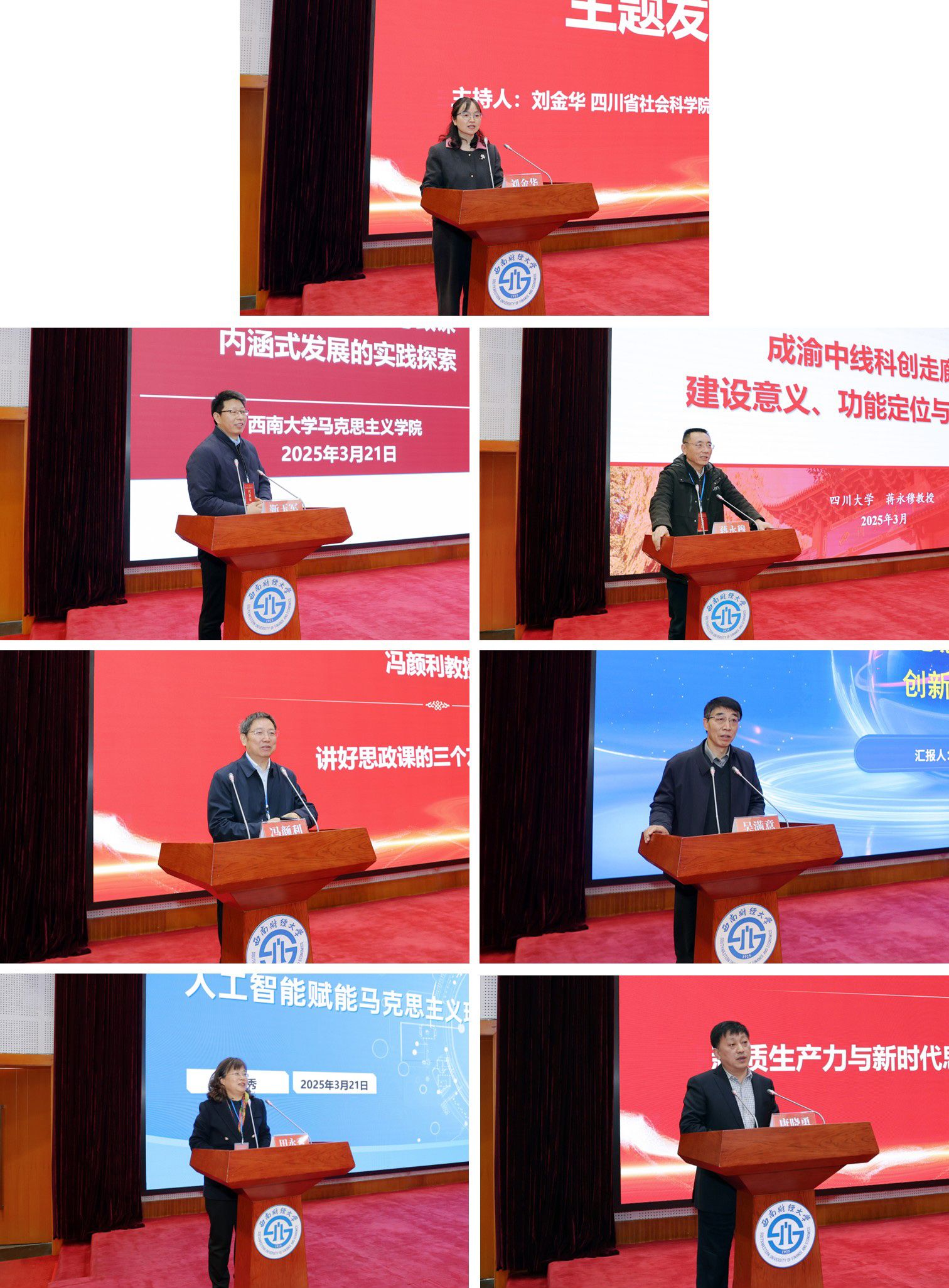 会议设置四个主旨发言环节。第一环节由四川省社会科学院马克思主义学院院长刘金华教授主持。西南大学马克思主义学院副院长靳玉军教授,教育部高校思政课“原理”分教指委委员、四川大学马克思主义学院院长蒋永穆教授,重庆大学马克思主义学院院长冯颜利教授,教育部高校思政课“德法”分教指委委员、电子科技大学马克思主义学院院长吴满意教授,西南交通大学马克思主义学院院长田永秀教授,教育部高校思政课“原理”分教指委委员、西南财经大学马克思主义学院院长唐晓勇教授分别围绕“思政课内涵式发展”“成渝中线科创走廊”“思政课教学方法论”“大数据时代思想政治教育方法创新”“人工智能赋能马克思主义理论学科建设”“新质生产力与新时代思想政治教育创新发展”等主题作了专题报告。