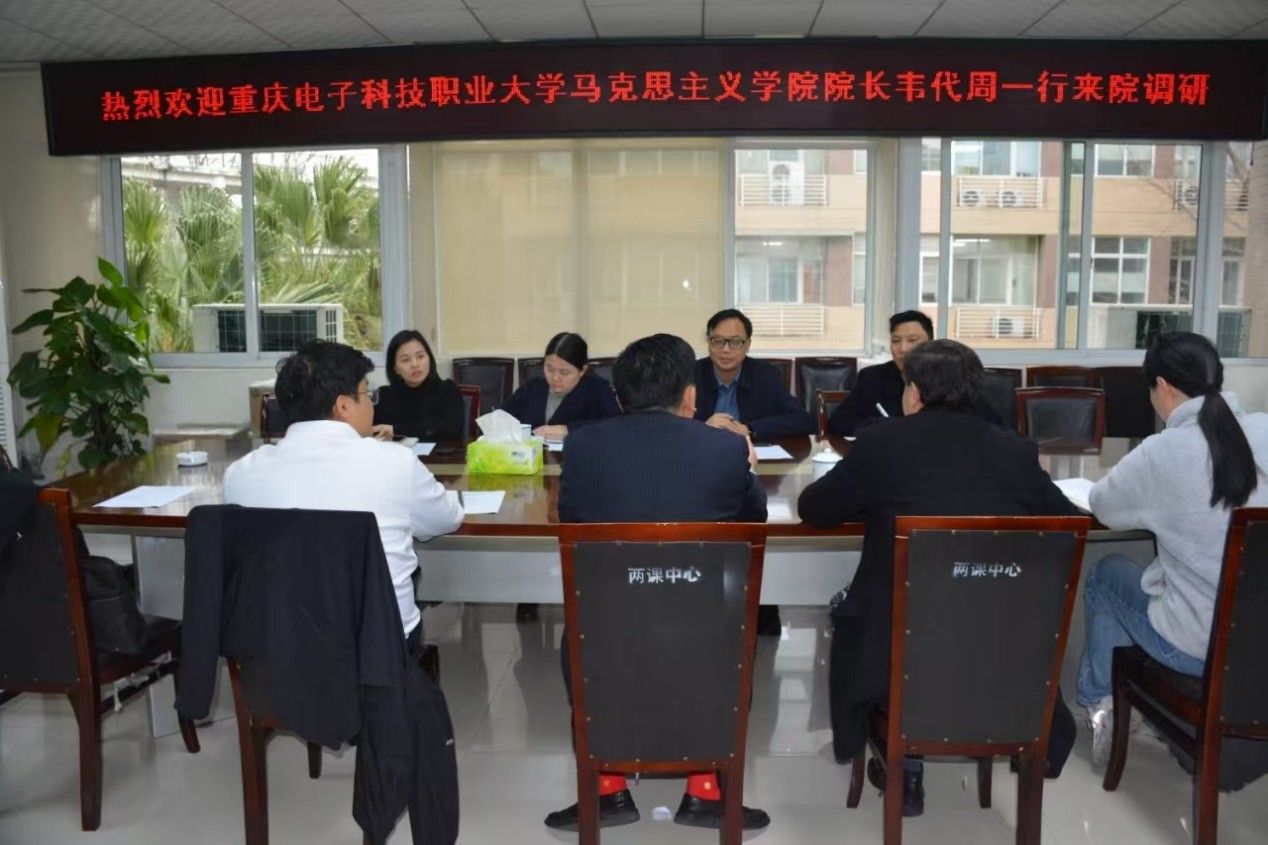 3月4日,重庆电子科技职业大学马克思主义学院一行四人来我院开展调研交流。此次交流旨在深入学习习近平总书记关于学校思想政治理论课建设的重要讲话和指示批示精神,借鉴我院在师资队伍建设、思政课课程设置、教学安排、考核评价、思政课实践教学和学院建设等方面的宝贵经验和优秀做法,以促进双方思政课建设的内涵式发展。