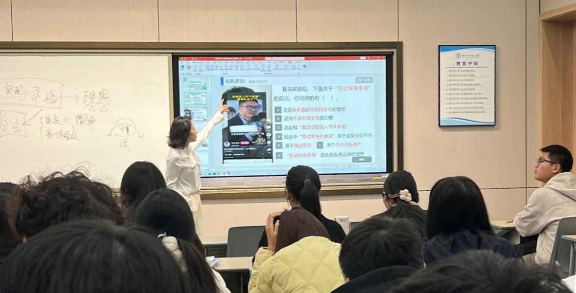 教学观摩环节分别安排在上午第二节、第四节进行。敬狄老师在C305教室进行了第二章“追求远大理想 坚定崇高信念”的授课。敬老师从理想信念的哲学基础出发,深入阐释了马克思主义关于劳动、幸福与自由的经典理论,结合《共产党宣言》《资本论》等原著内容,引导学生理解理想的超越性与现实性。