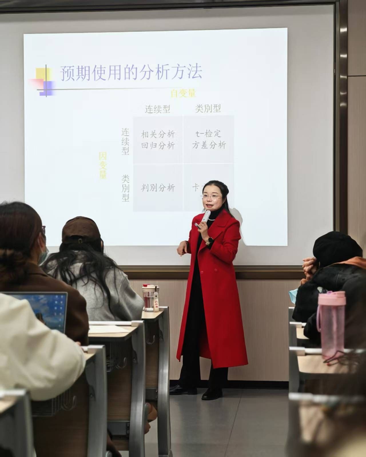 讲座伊始,李教授以好研究的标准为切入点,引发同学们对研究问题的深入思考。随后,她针对问卷设计和发放等细节进行讲解,有效解答了同学们在定量分析方法选择中的普遍困惑。讲座尾声,我院李春梅教授对讲座进行总结,鼓励同学们将所学的技巧切实运用到学术实践中。