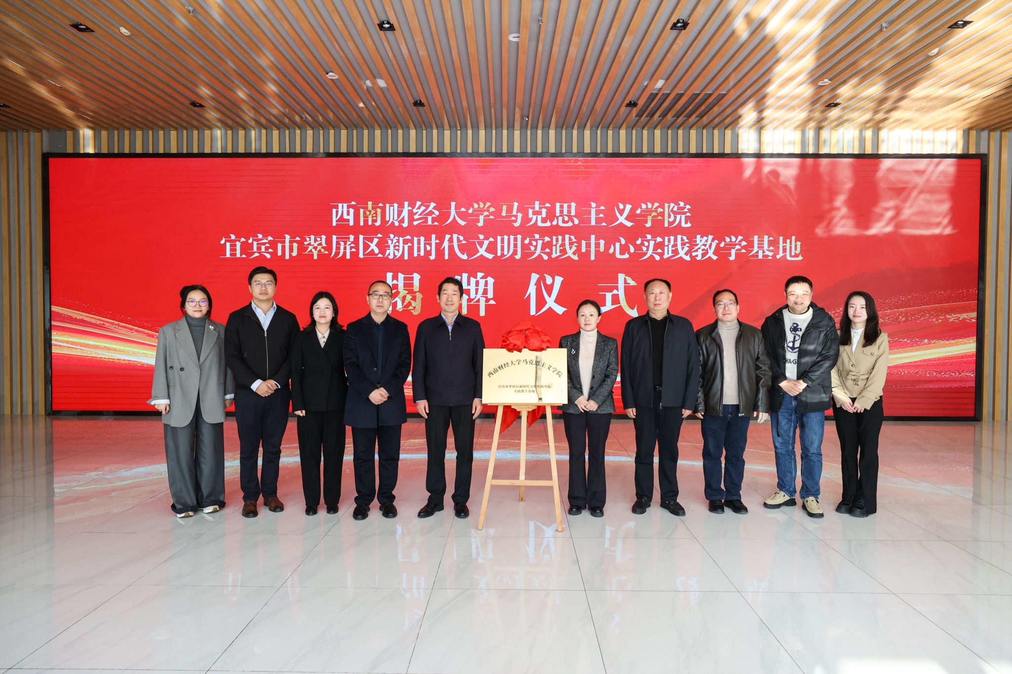 在揭牌仪式上,陈宗权与白静共同为“西南财经大学马克思主义学院宜宾市翠屏区新时代文明实践中心实践教学基地”揭牌。