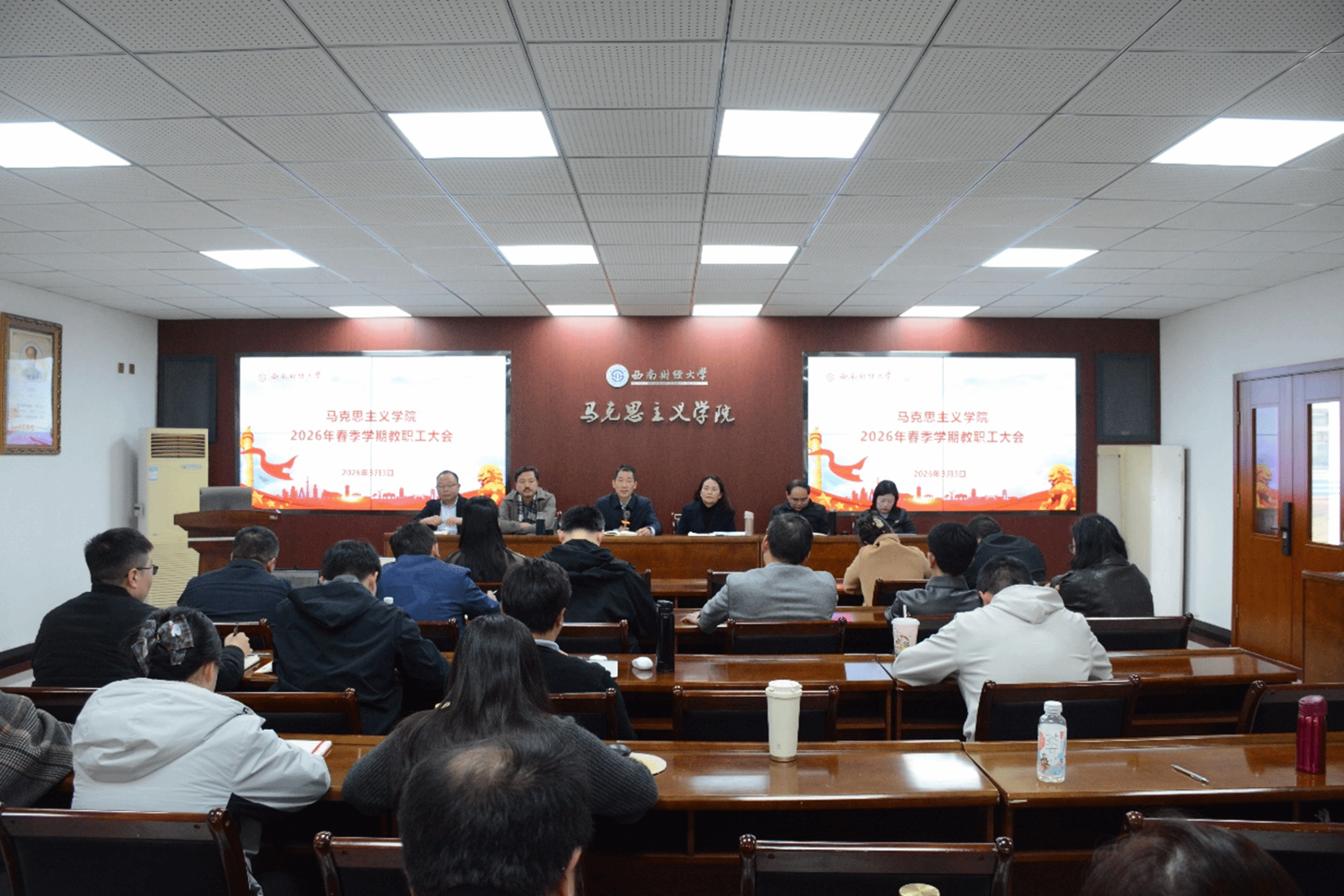 3月3日下午,马克思主义学院在通博楼A117会议室召开2026年春季学期第一次教职工大会,由学院党委书记周敏主持,全体教职工参会。