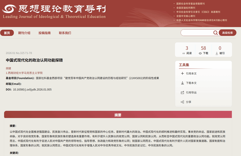 近日,我院教师胡建教授在《思想理论教育导刊》2026年第1期上发表题为《中国式现代化的政治认同功能探赜》的学术论文。《思想理论教育导刊》是马克思主义理论类的权威期刊,该文的发表充分展现了我院教师的扎实学术功底和科研创新能力。