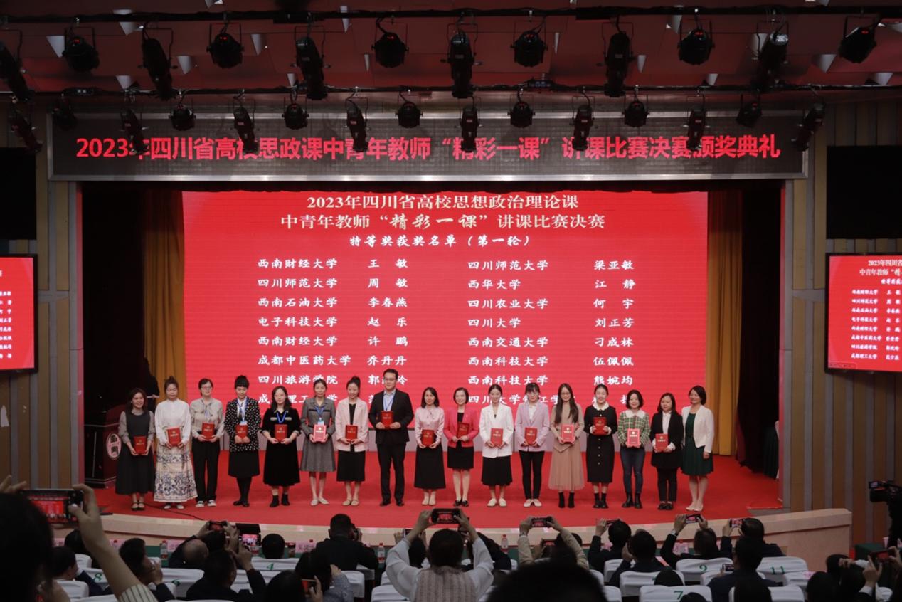 省委教育工委委员、教育厅党组成员、副厅长石静出席颁奖仪式并讲话,川师大副校长郭朝辉在颁奖仪式上致辞,省教育厅宣传思想与统战工作处处长李大鹏主持颁奖仪式。经专家评审,共有56所高校136名教师入围决赛,分本科组和高职高专组共11个组别进行比赛。经过激烈角逐,比赛最终评选出特等奖32名,一等奖38名,二等奖66名。其中王敏、许鹏获特等奖,刘佳怡获一等奖,周洁、杜颖获二等奖。本次比赛复赛在我校举行,共107所高校447名教师参加。