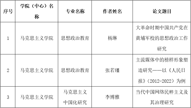 根据《西南财经大学优秀博士、硕士学位论文评选办法》,经马克思主义学院学位评定分委员会评议,拟推荐杨琳、张若瑾和李博雅三位同学的硕士学位论文参评2023届校级优秀硕士论文。现将相关情况公示如下:
