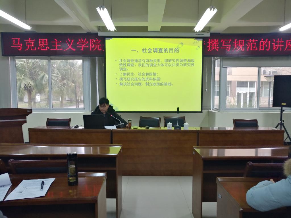 为了提升研究生寒假社会调研质量,帮助学生更好地撰写社会实践调研报告,1月8日上午10点,马克思主义学院段江波教授在通博楼A117举行了主题为《社会调研报告撰写规范》的学术讲座。此次讲座由马克思主义学院王磊老师主持,学院研一全体同学和研二、研三部分同学参加了此次讲座。